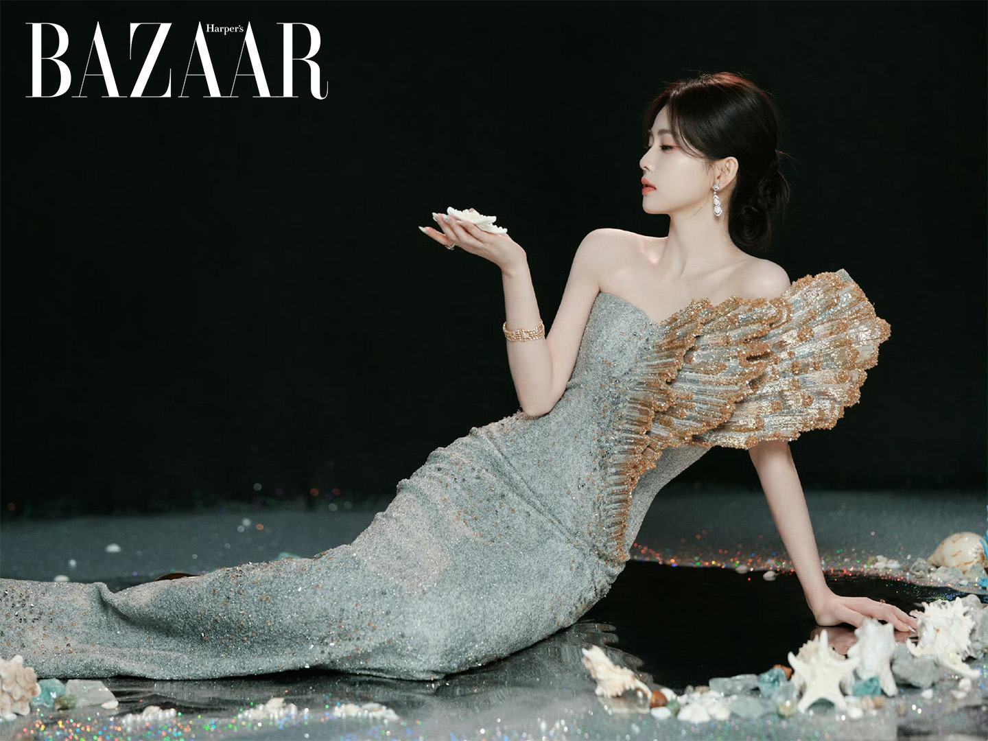Nữ diễn viên trung thành với váy ôm sát để khoe vóc dáng siêu mảnh mai. Bề mặt chất liệu phủ kín hạt sequin và pha lê li ti tạo nên hiệu ứng lấp lánh như lớp sương ánh kim. Điểm nhấn thị giác tập trung ở cấu trúc điêu khắc tại phần vai, mở rộng như vỏ sò, tạo nên sự tương phản tinh tế với phần thân váy thon gọn.