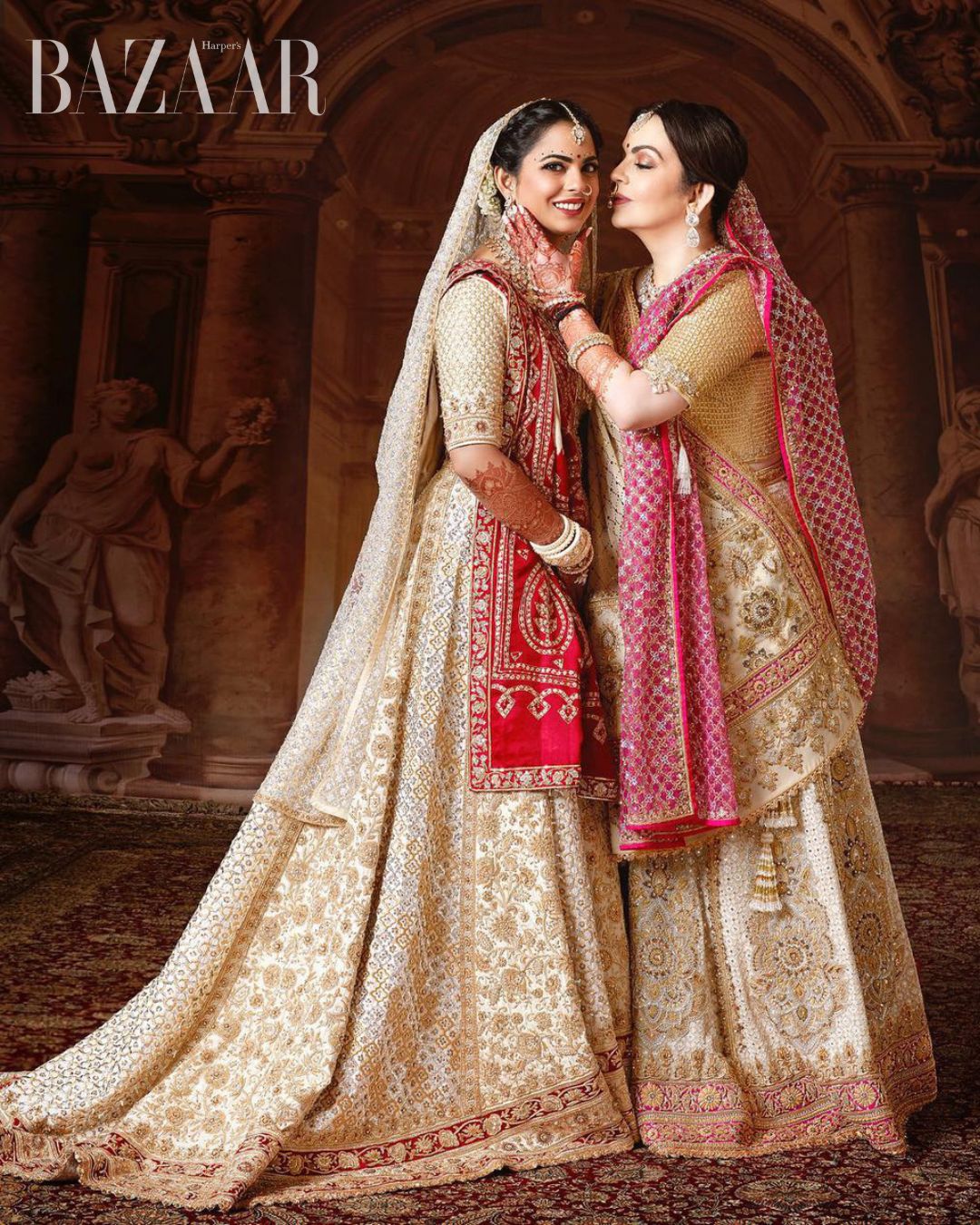 Isha nhiều lần diện trang sức, trang phục từ mẹ. Hình trên chụp trong ngày cưới của Isha, khi cô diện chiếc saree của mẹ. Ảnh: India Today