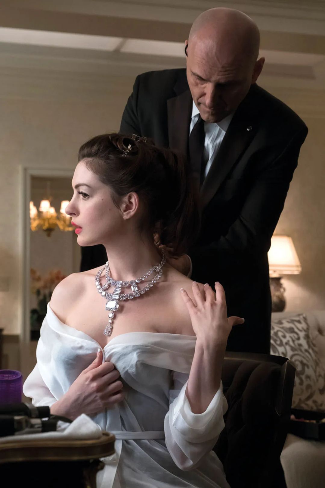 Anne Hathaway, trong vai Daphne Kluger, đeo chiếc vòng cổ tái tạo lại Cartier Toussaint trong Ocean’s 8. Ảnh: Warner Bros