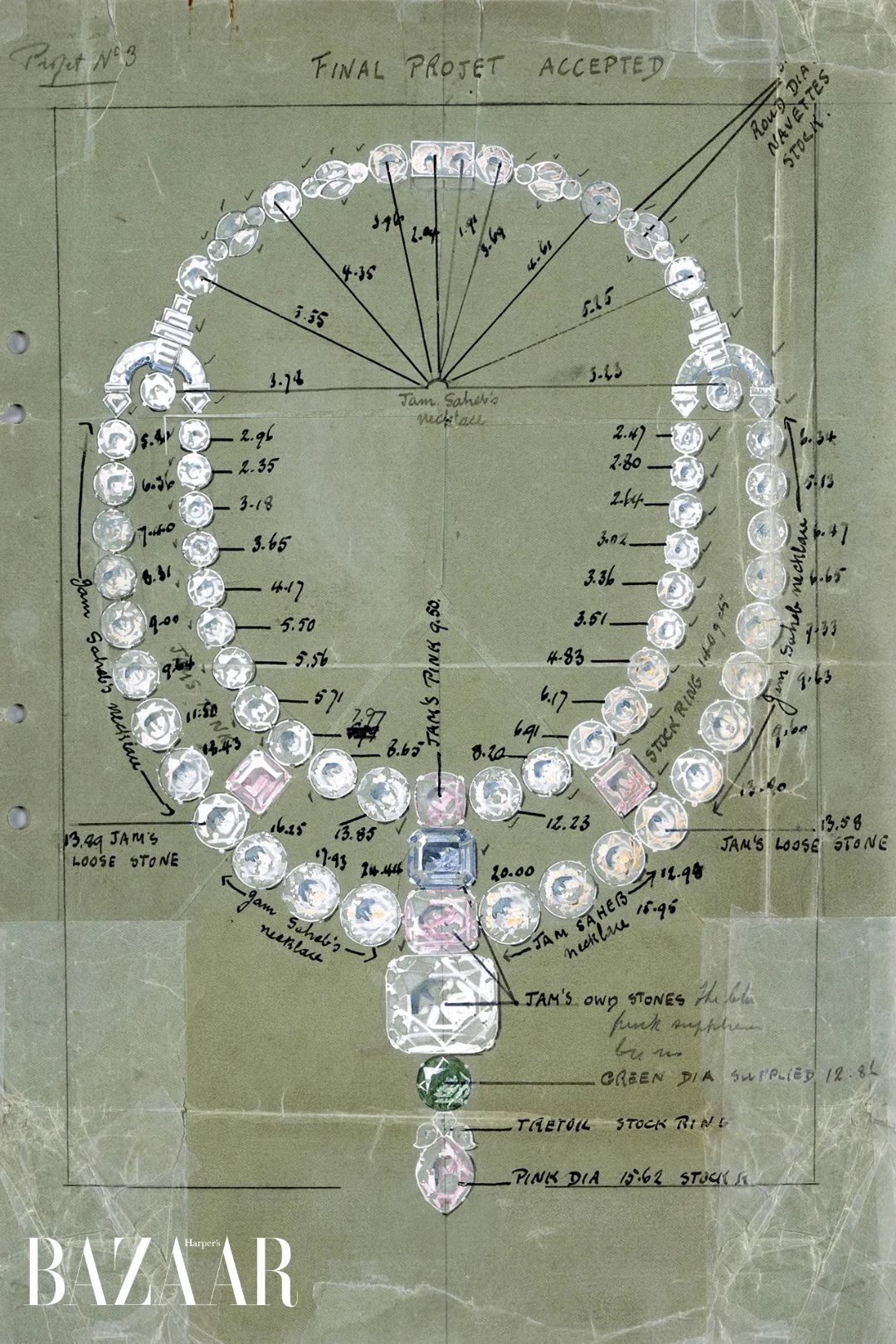 Bản vẽ của chiếc Cartier Toussaint. Có thể thấy những dòng ghi chú như “Jam’s Own Stones” từ những viên kim cương hồng, xanh và Queen of Holland, ý chỉ chúng thuộc sở hữu của Ranjitsinhji Vibhaji, người nắm giữ tước vị Jam Sahib, gọi tắt là Jam. Viên kim cương lớn nhất chính là Queen of Holland. Ảnh: Warner Bros. Pictures