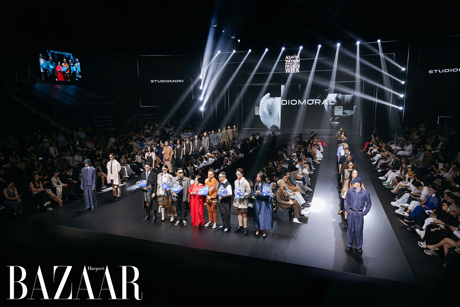 Khoảnh khắc kết màn, khi dàn người mẫu bất ngờ chạy thẳng xuống khán đài, không tuân theo lối đi cố định, không dàn dựng bài bản – chính là “lời kết” hoàn hảo cho tinh thần phóng khoáng và tự do mà STUDIOMORAL đã truyền tải suốt show diễn.