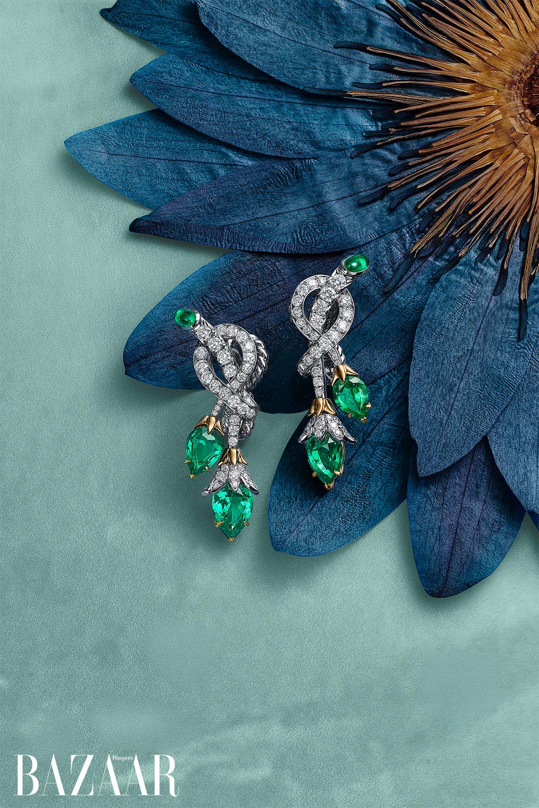 Ở phiên bản emerald, các viên đá hình giọt lê và cabochon được tuyển chọn hoàn hảo, kết hợp cùng kim cương và điểm nhấn vàng 18k, tạo chiều sâu và kết cấu. Trong khi đó, phiên bản kim cương sử dụng những đường cong mềm mại ôm theo cơ thể, kết thúc bằng các viên kim cương giọt lê.