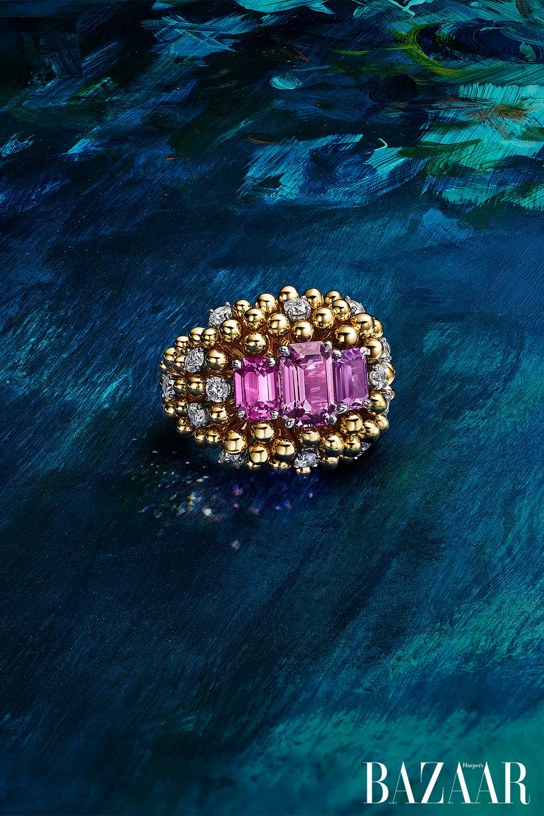 Marguerite diễn giải hoa cúc với hai phong cách: một sử dụng sapphire hồng không xử lý, mang vẻ mềm mại rực rỡ; một sử dụng kim cương emerald-cut, phá vỡ cấu trúc truyền thống thông qua khoảng không âm đầy táo bạo.