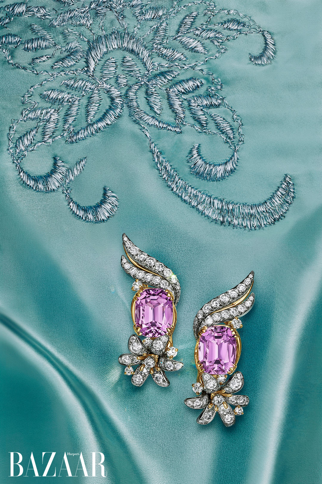 Ẩn mình trong những tán lá là các viên sapphire cushion không xử lý đến từ Sri Lanka và Madagascar, được tuyển chọn đồng nhất. Song song đó, họa tiết lá trở thành nền tảng cho những sáng tạo kim cương ấn tượng, nổi bật với đôi hoa tai sử dụng kim cương emerald-cut loại D, hoàn mỹ nội tại, tổng trọng lượng trên 10 carat. Sự kết hợp hai kim loại trong thiết kế phản ánh di sản đặc trưng của Tiffany trong việc hòa quyện bạch kim và vàng.