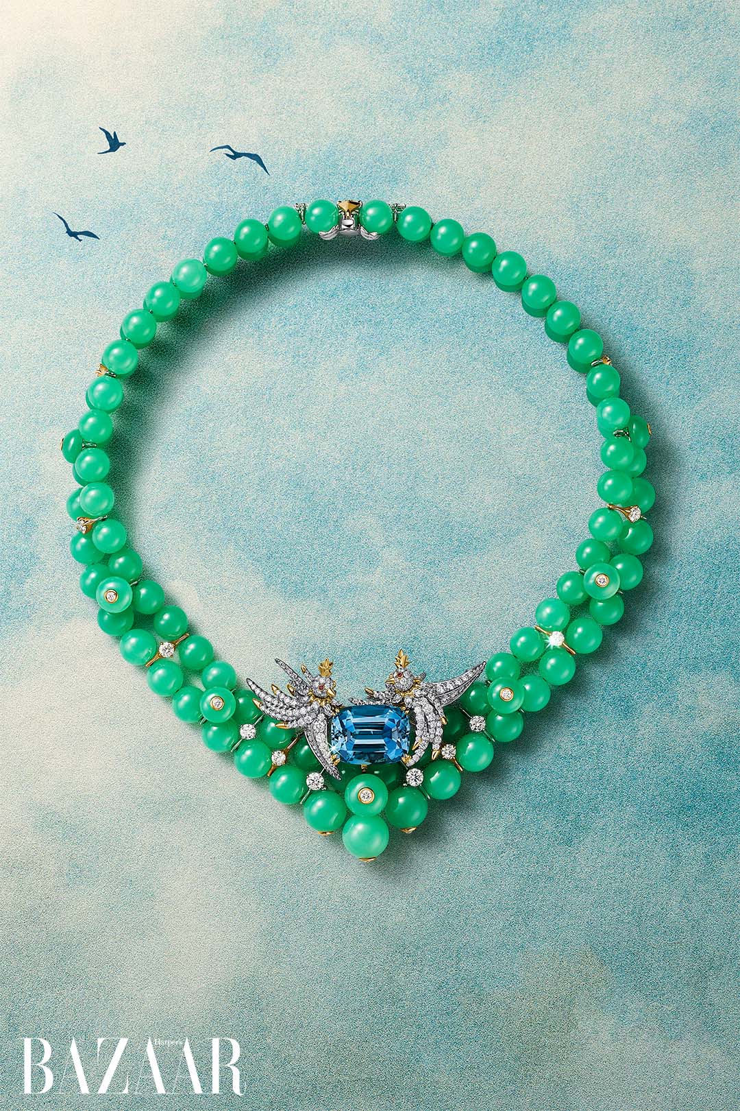 Trong câu chuyện Bird on a Rock, thiết kế biểu tượng của Tiffany một lần nữa cất cánh, đậu trên những viên aquamarine Santa Maria sắc xanh sâu thẳm, cắt cushion, đến từ Brazil. Các hạt chrysoprase được cắt riêng tạo nên khung cảnh xanh tươi, làm nổi bật sắc xanh bão hòa của aquamarine. Một thiết kế vòng cổ biến đổi, với đôi chim sống động và viên aquamarine hơn 22 carat, cũng có thể được đeo như trâm cài.