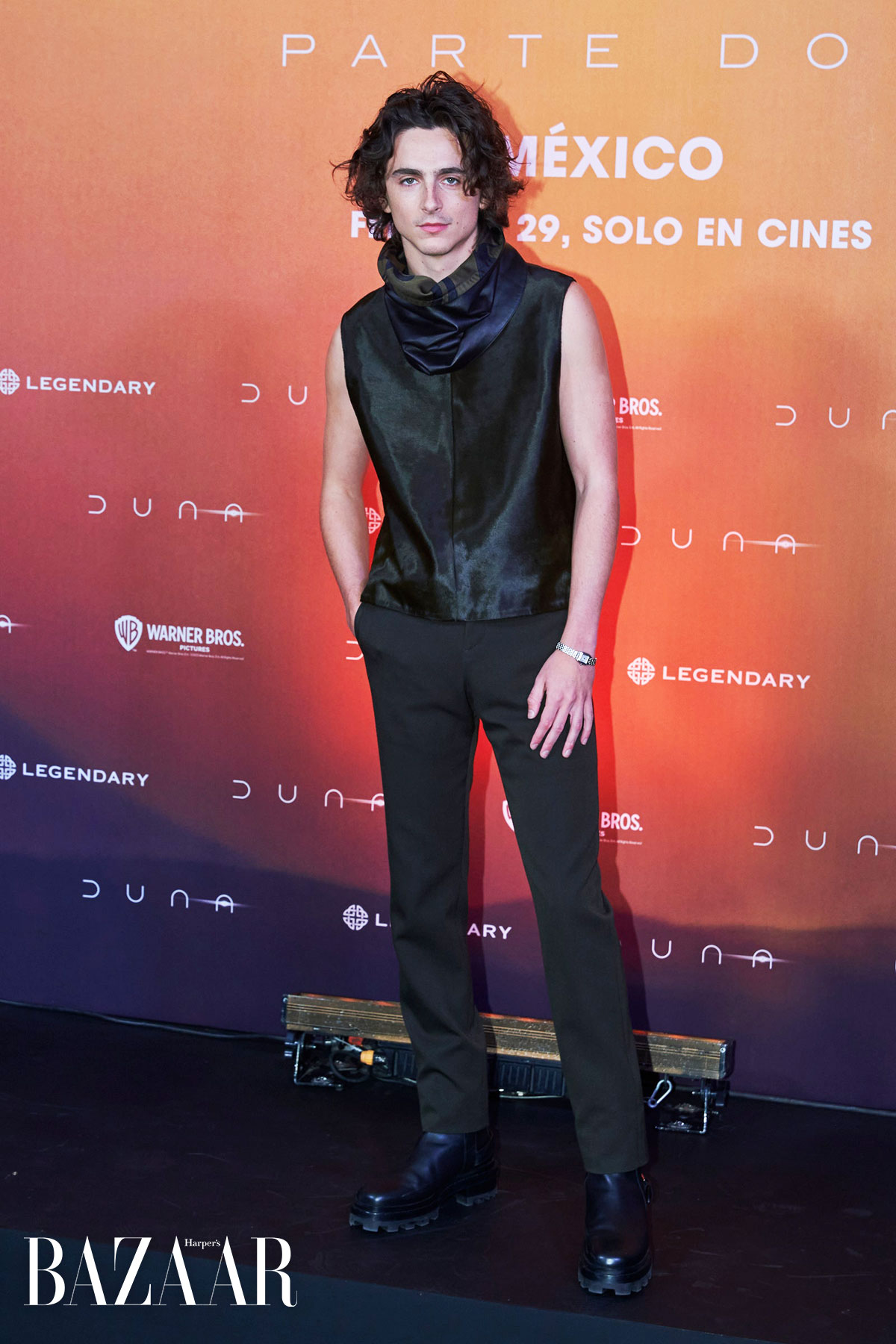 Trong phim Dune: Hành tinh cát, Timothée Chalamet vào vai Paul Atreides, chàng thủ lĩnh trẻ tuổi của gia tộc Atreides chống lại gia tộc Harkonnen. Bước lên thảm đỏ quảng bá phim trong press tour, anh cải biến phong cách chiến binh xứ cát thành trang phục hiện đại, đậm chất vị lai.