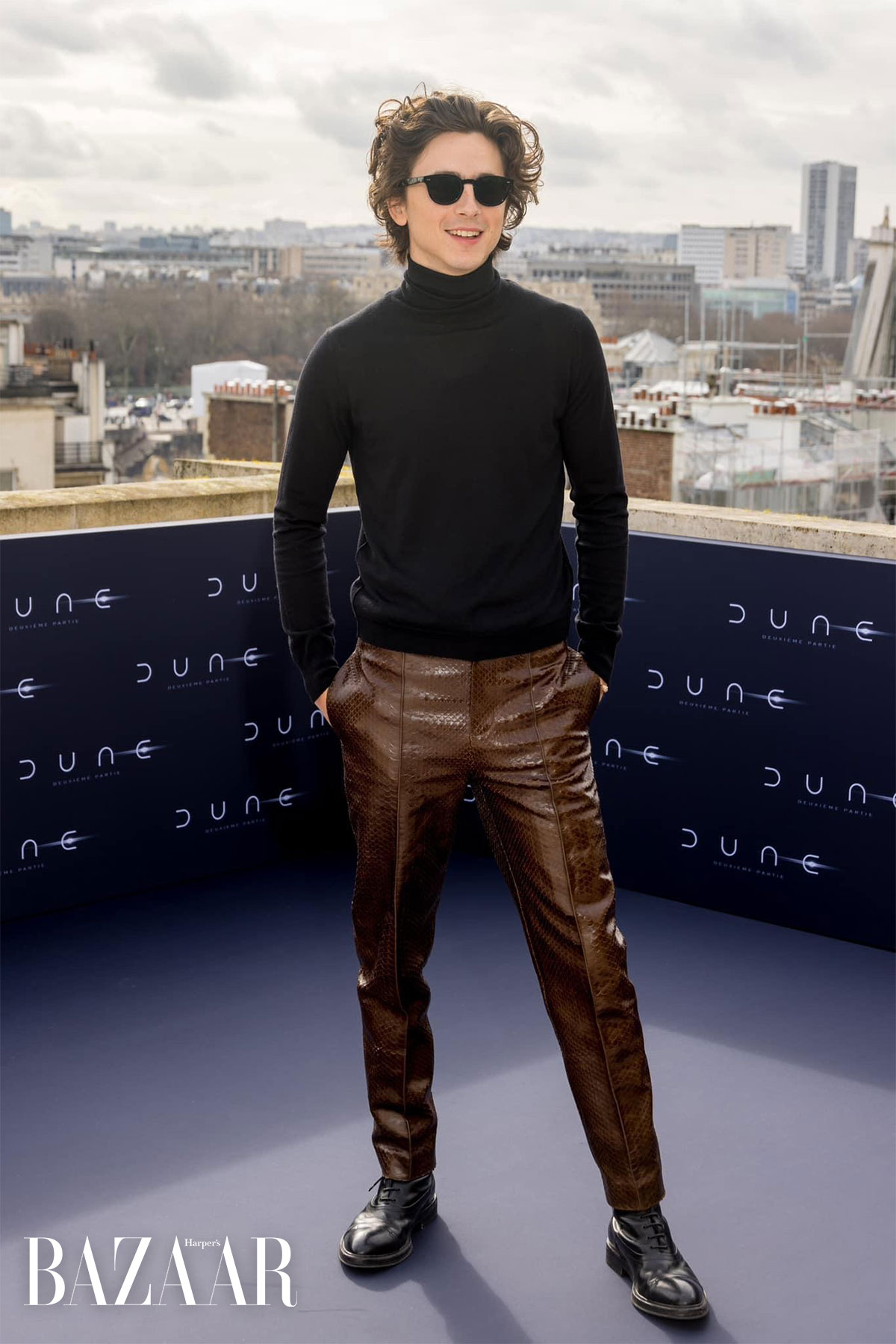 Một bộ cánh tưởng như không có liên quan gì đến chủ đề bộ phim Dune: Part Two nhưng thực tế lại rất liên quan. Chi tiết nằm ở chiếc cổ áo. Phần vạt che cổ gợi nhớ đến những chiếc áo bảo hộ rộng rãi, che mặt của Paul Atreides nói riêng và các nhân vật trong phim nói chung. Phối với đôi bốt da chunky, Timothée Chalamet toát lên vẻ phong trần dù diện quần ống ôm, vốn được xem là trang phục có phần đỏm dáng hơn.