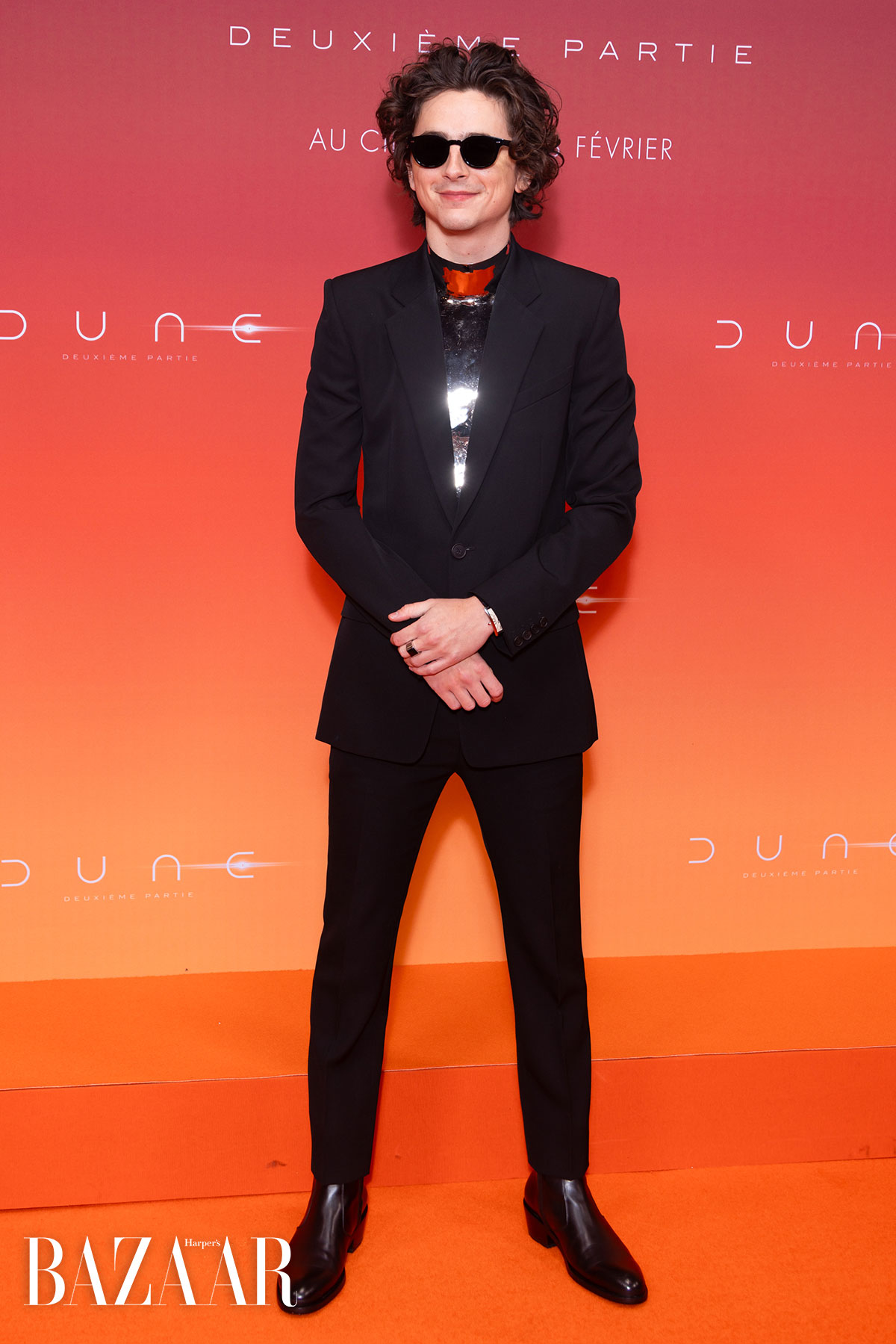Bộ cánh rất bảnh bao và ôm sát từ Givenchy thoạt nhiên trông cổ điển, nhưng khi nhìn kỹ hơn, người ta phát hiện nam diễn viên không hề mặc áo sơ-mi mà lại mặc chiếc tấm giáp che ngực bóng loáng bên dưới. Miếng giáp kim loại được làm từ đồng lấy cảm hứng từ một mẫu trong BST Haute Couture Thu Đông 2018 của Givenchy, và cũng phản ánh trang phục chiến binh trong phim Dune: Hành tinh cát 2 của Timothée Chalamet.