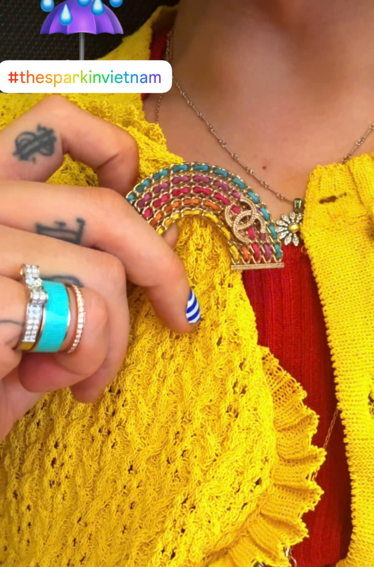 “Ông hoàng thời trang” là danh xưng G-Dragon xứng đáng sở hữu, phần vì khả năng phối màu độc đáo. Outfit lần này của anh tiếp tục là một bản phối rực rỡ đúng chất, nhưng điều đặc biệt nằm ở tổ hợp màu đỏ và vàng – gam màu gợi nhớ trực tiếp đến quốc kỳ Việt Nam, hiện diện đầy chủ đích trên trang phục và phụ kiện. G-Dragon mặc áo len đỏ, khoác ngoài bằng cardigan vàng nằm trong look 18 thuộc bộ sưu tập Chanel Cruise 2025.