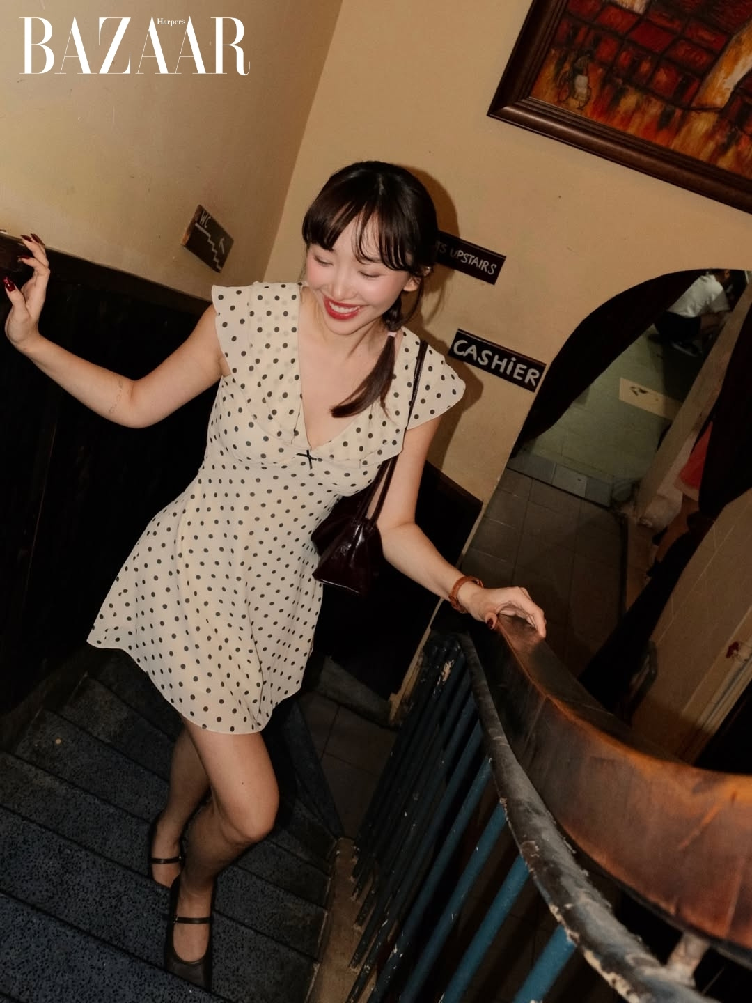 Dù không mặc váy form chữ A thịnh hành của thập niên 1960, Tóc Tiên vẫn dễ dàng hòa mình vào phong cách retro này nhờ họa tiết chấm bi. Chi tiết nhún bèo nữ tính và lãng mạn, nhưng form dáng ôm sát cùng cổ chữ V gợi cảm vừa đủ. Các chấm bi đen ton-sur-ton với túi và giày giúp tạo hình của Tóc Tiên thêm phần thời thượng.