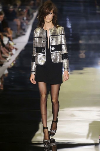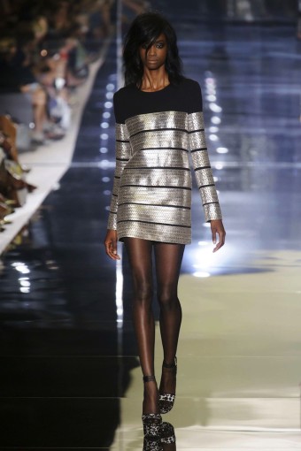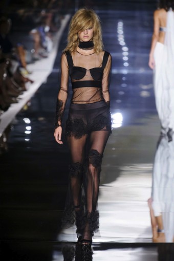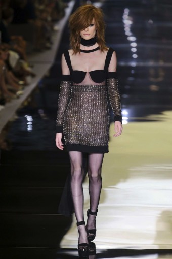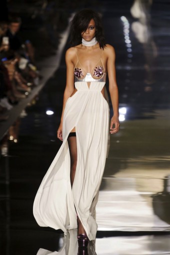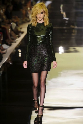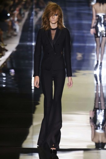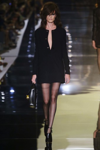 Mùa Xuân Hè lần này, Tom Ford trình diễn một binh đoàn glam rock gồm những quý cô gương mặt lạnh lùng, make-up mắt khói môi nude, tóc đánh phồng rối, mái dài che kín một bên mắt. Họ sải bước trên sân khấu bóng loáng như gương trong những thiết kế sexy đến tận cùng. Tom Ford đã lấy cảm hứng từ chính những thiết kế trong quá khứ của mình. Cụ thể là bộ sưu tập mà ông lấy ý tưởng từ các bức ảnh polaroid nhạy cảm của Carlo Mollino những năm 1990, hay một số thiết kế “hit” mà ông đã thực hiện cho Gucci. Ví dụ điển hình là chiếc đầm tay dài màu trắng có chi tiết cut-out hai bên eo, gợi nhớ bộ đầm dài màu trắng bằng chất liệu jersey trong chiến dịch Thu Đông 1996 của Gucci.