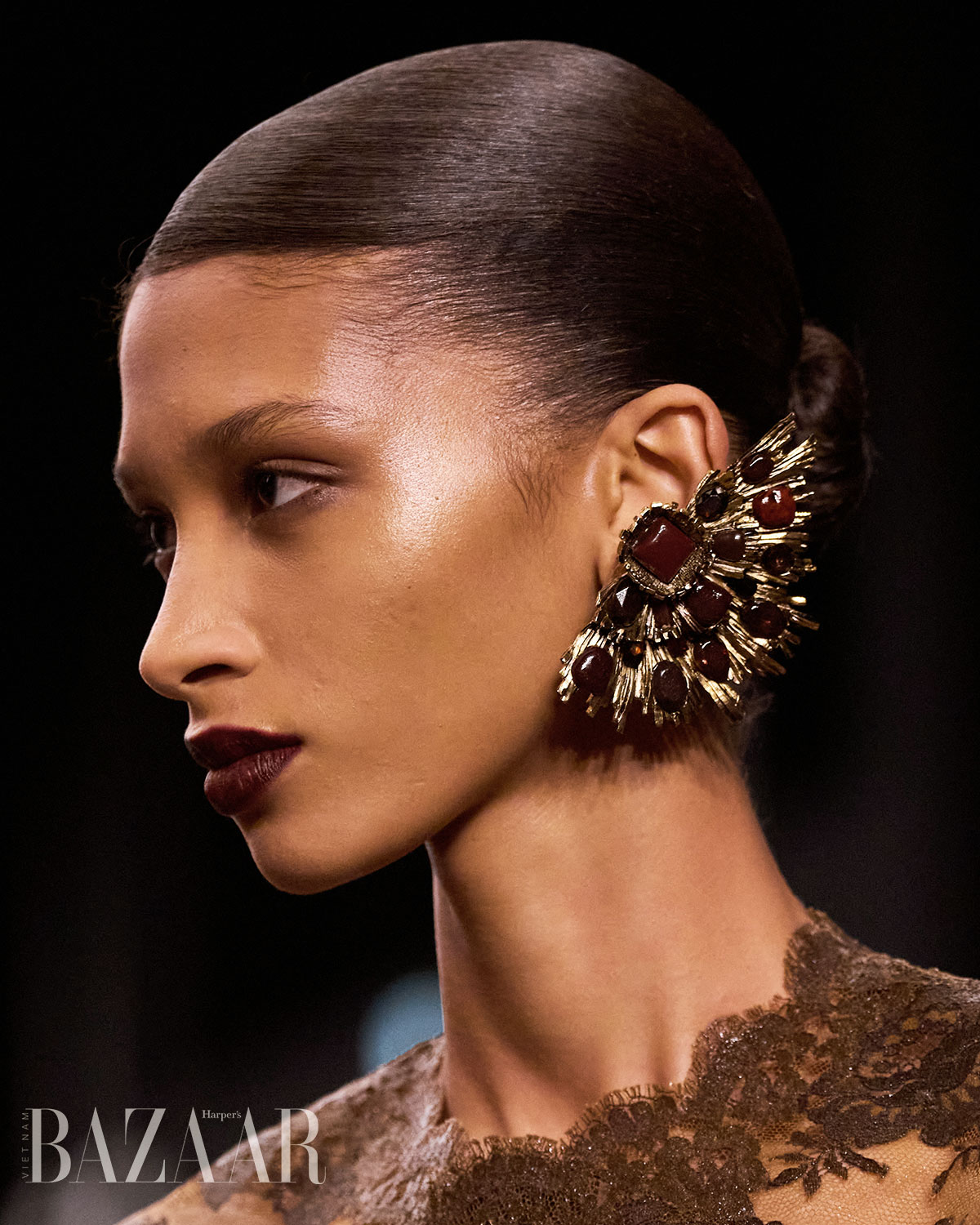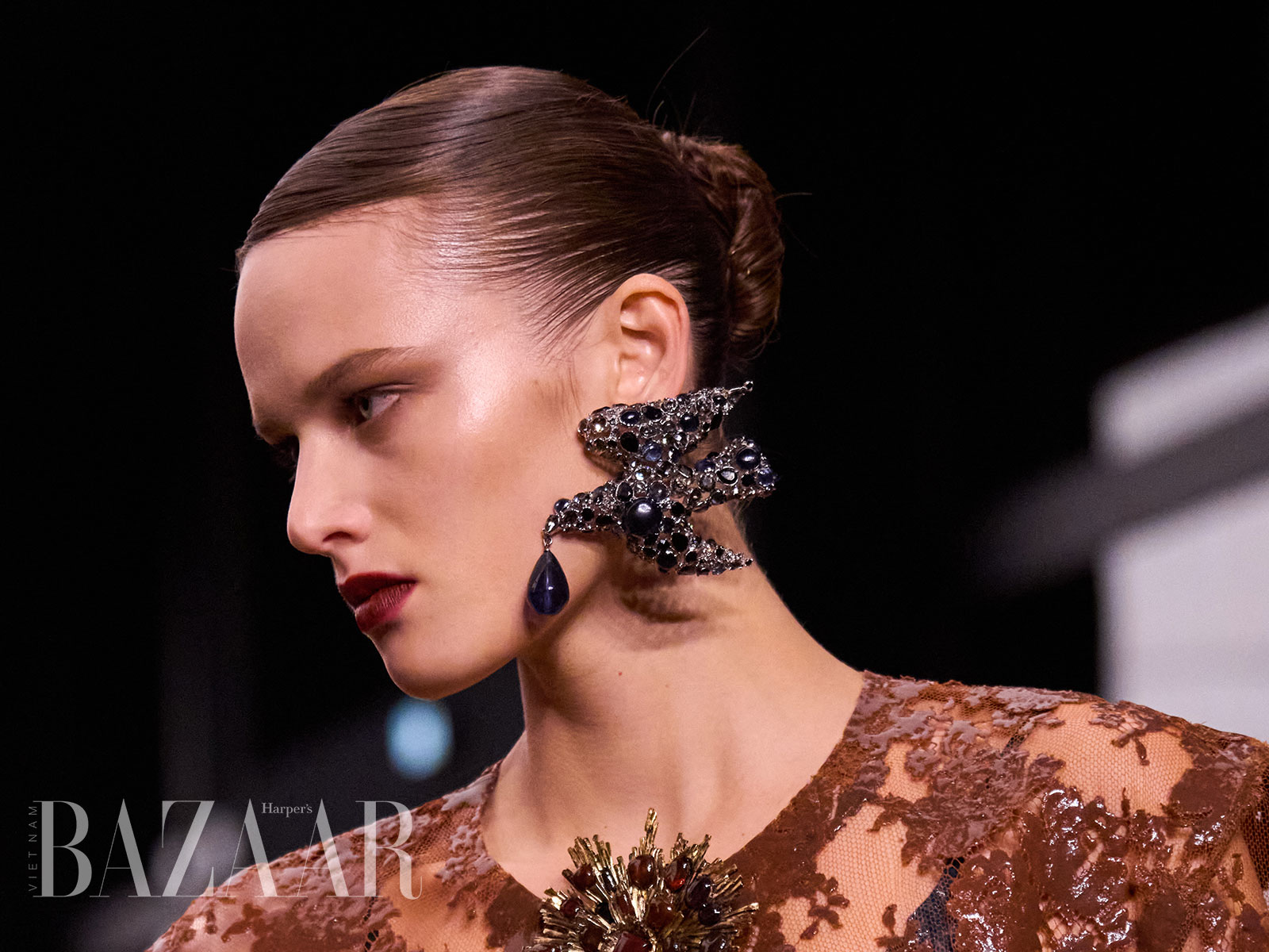Điểm nhấn then chốt của tạo hình Tống Giai tại show Saint Laurent Thu Đông 2026 nằm ở đôi khuyên tai kim loại đính đá cỡ đại. Thiết kế dạng tròn, cấu trúc nhiều tầng, đan xen giữa kim loại ánh bạc và những viên đá màu hổ phách sẫm, tạo hiệu ứng chuyển động mỗi khi cô xoay đầu. Đây là kiểu trang sức đòi hỏi người đeo phải có thần thái đủ mạnh để “chịu” được trọng lượng thị giác của nó.