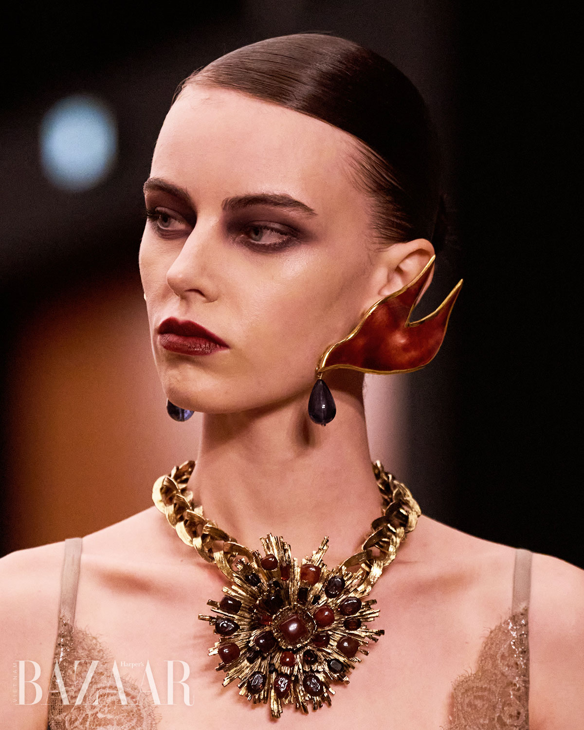 Những cấu trúc kim loại cỡ đại, đính đá lấp lánh hay tạo hình điêu khắc táo bạo không còn bị xem là quá tay. Trái lại, chúng dần được công nhận như “át chủ bài” giúp tổng thể trở nên rực rỡ và nổi bật hơn chỉ trong tích tắc.