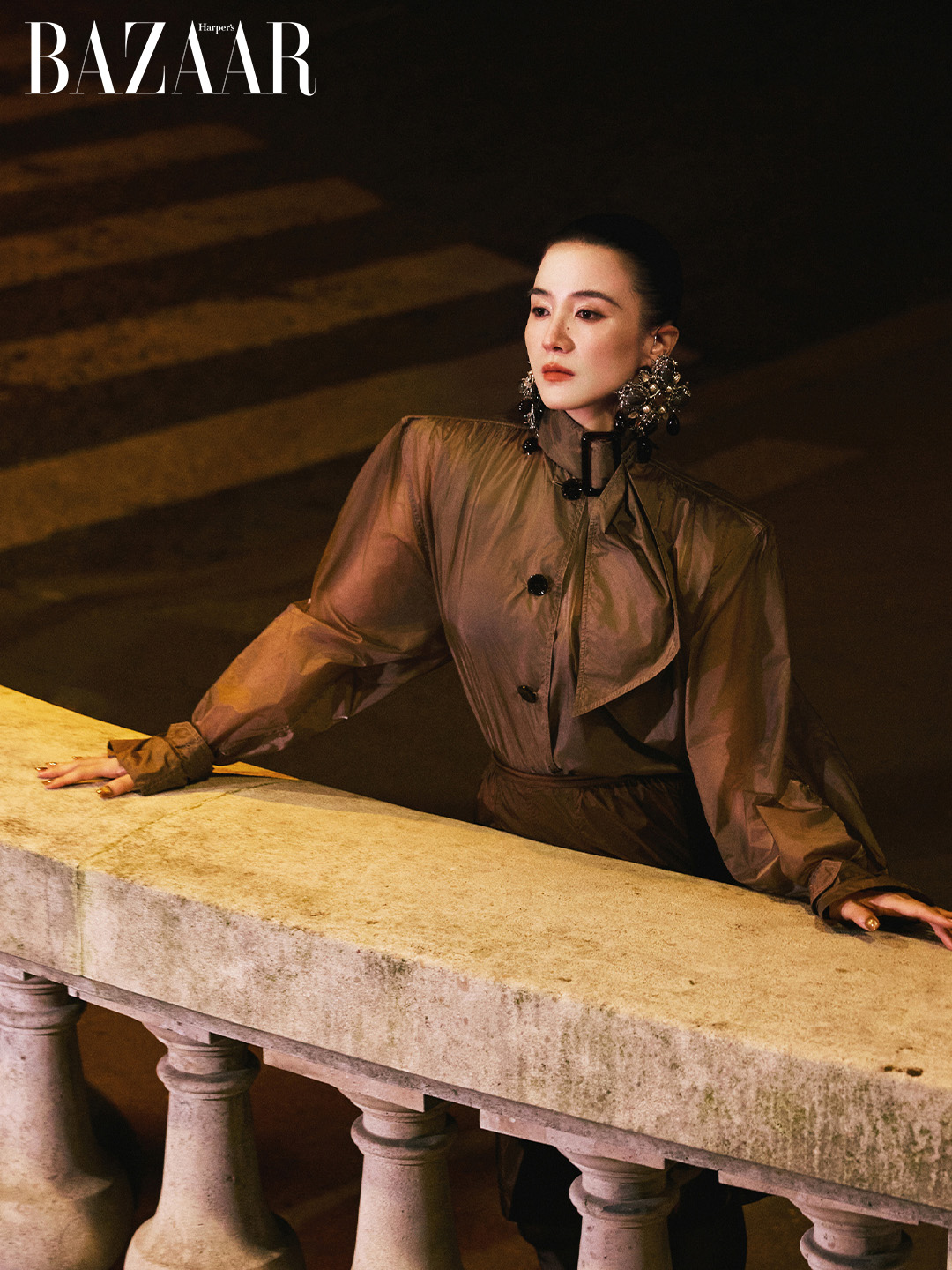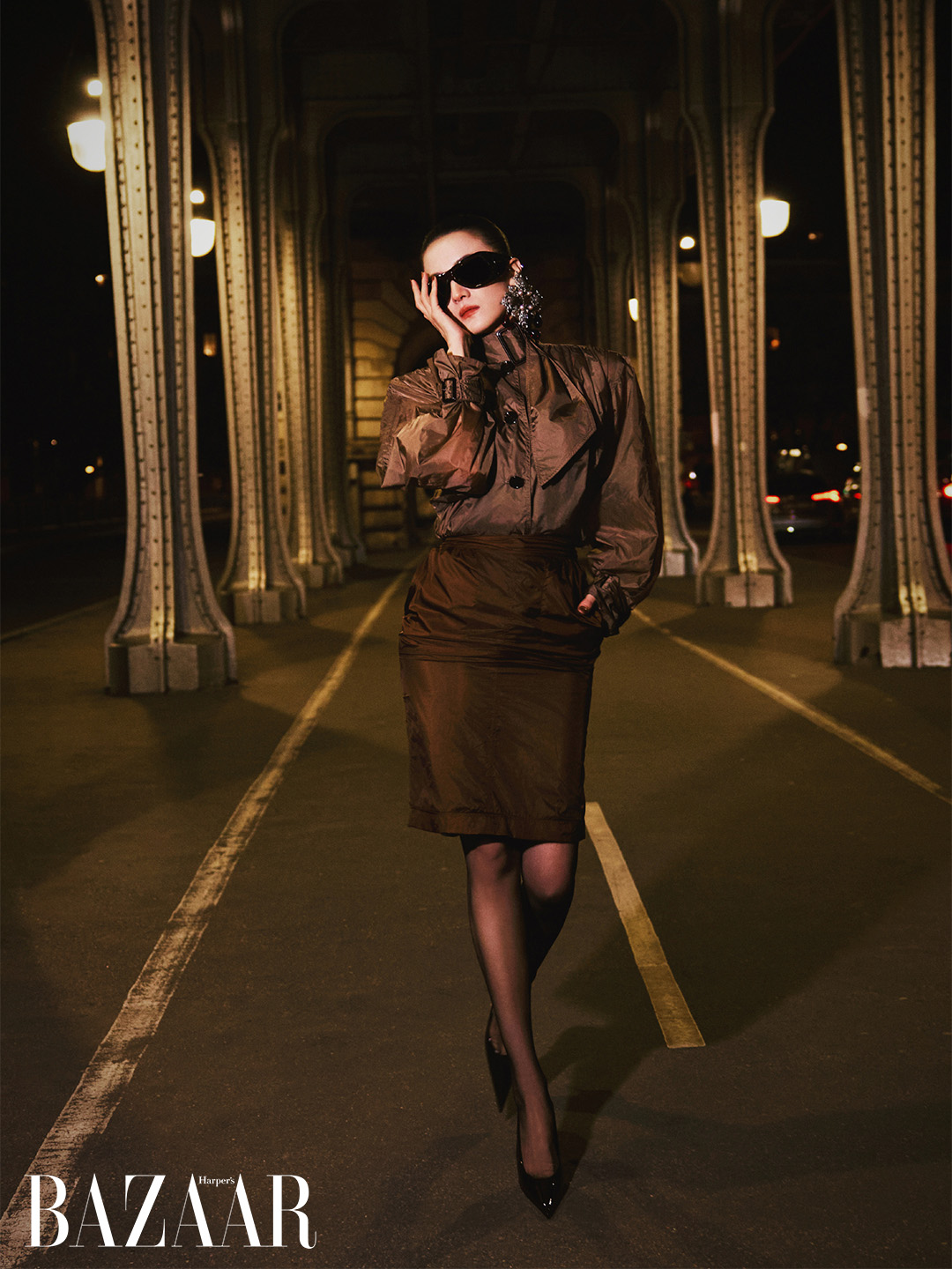 Cô chọn sơ-mi polyamide cao cổ, chất liệu bóng nhẹ phản chiếu ánh đèn Paris về đêm. Phom áo rộng ở phần vai, tay áo phồng nhẹ, tạo cấu trúc vững chãi cho phần thân trên. Đi cùng là chân váy bút chì màu nâu đồng dài qua gối, ôm sát cơ thể, tôn lên tỷ lệ hình thể 1m73 với khung xương thẳng và phần hông gọn gàng. Tổng thể được hoàn thiện bằng đôi cao gót da bóng mũi nhọn, sắc sảo như một nét gạch kết thúc hoàn hảo.