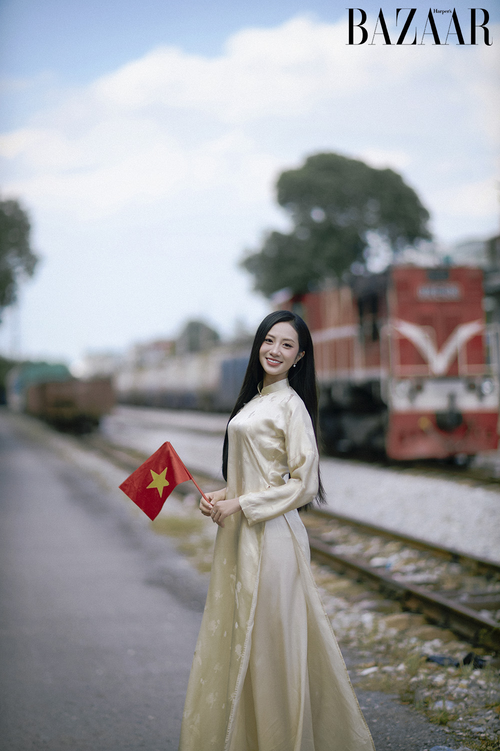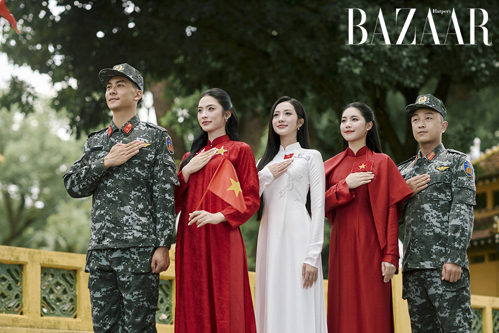 “Màu đỏ của quốc kỳ, màu trắng tinh khôi của mây trời ngày độc lập, màu xanh chiếc áo lính trong một khuôn hình tạo nên sự hòa quyện độc đáo giữa nét rạng ngời như biểu tượng người con gái Việt song hành cùng khí chất mạnh mẽ của người lính, một bức tranh ngợi ca về lòng yêu nước của thế hệ trẻ thời bình theo một cách rất riêng. Tôi tin rằng đó chính là thông điệp sống động về tình yêu quê hương, niềm tự hào dân tộc và sự gắn kết bền chặt giữa hậu phương với tiền tuyến – chung một nhịp đập gìn giữ non sông gấm vóc Việt Nam”, NTK Dũng Nguyễn chia sẻ.