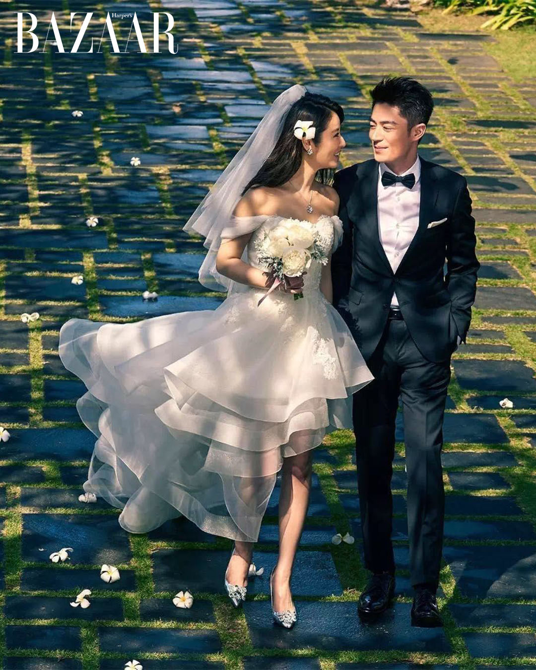 Từ Nghệ Dương cũng chọn thương hiệu Chaumet ảnh cưới chính thức, nhưng ở nhiều dòng trang sức khác nhau: hoa tai Éclat Floral, vòng tay Joséphine Aigrette Pavé đến chiếc nhẫn Triomphe de Chaumet. Ý nghĩa chung là sự lộng lẫy của hoàng gia. Chaumet từng là thương hiệu chế tác trang sức cho hoàng hậu Joséphine nước Pháp. Mỗi cô dâu khi chọn Chaumet đều như đang bước vào ngày cưới với ánh hào quang của một nữ vương, nhất là nếu chọn tiara cưới của thương hiệu.