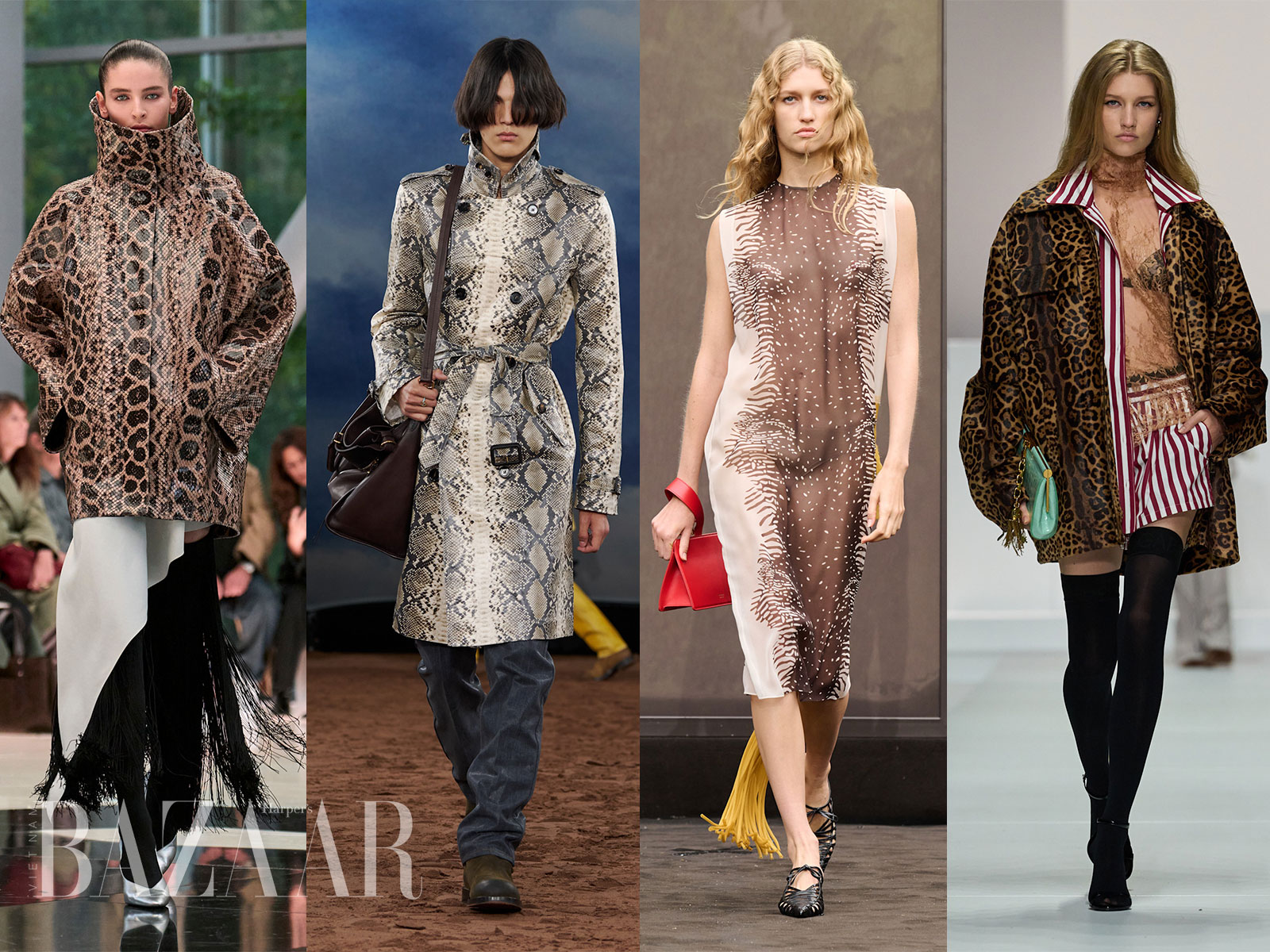 Từ nhiều mùa, họa tiết da động vật vẫn chưa hết hot. Da báo (leopard print) thậm chí có thể được xem như một…họa tiết trung tính mới của làng thời trang cao cấp! Bên cạnh da báo, những họa tiết khác như da trăn cũng trở nên thịnh hành.