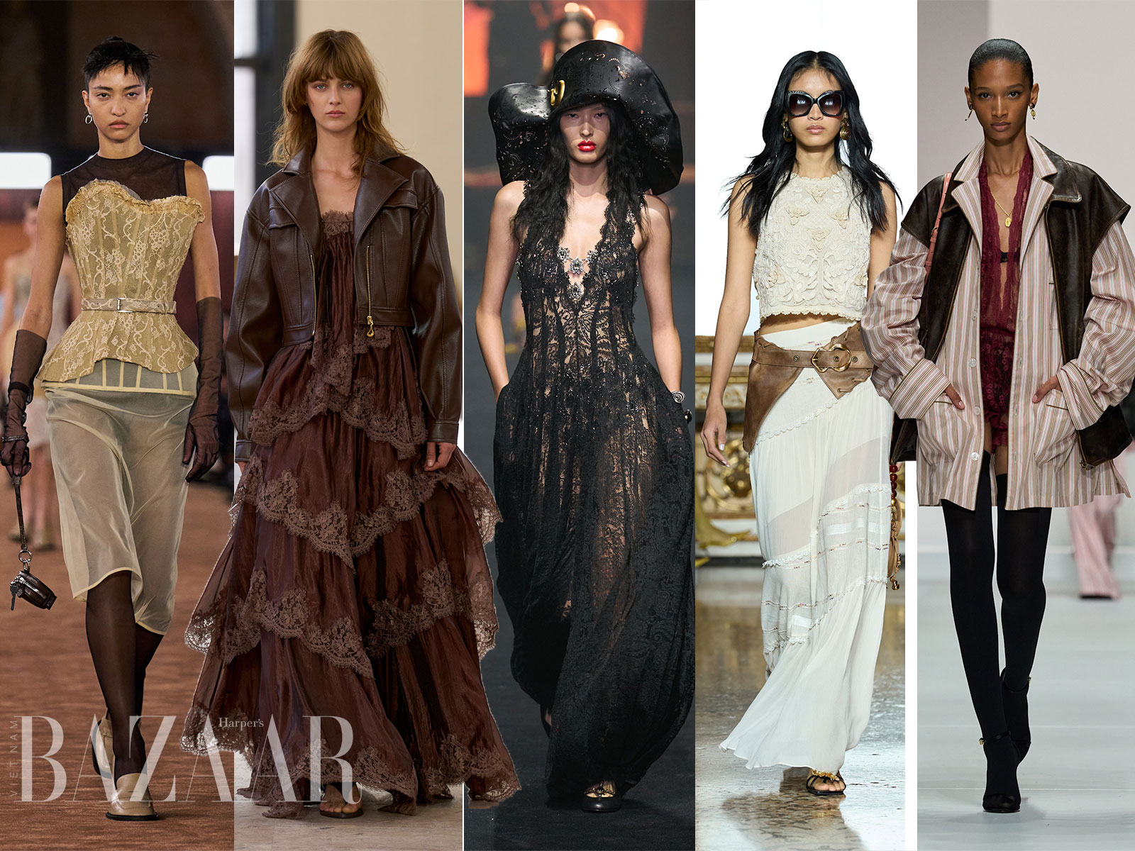 Một tổ hợp lạ mắt khác của mùa Xuân Hè 2026 là phối hợp ren với da thuộc.