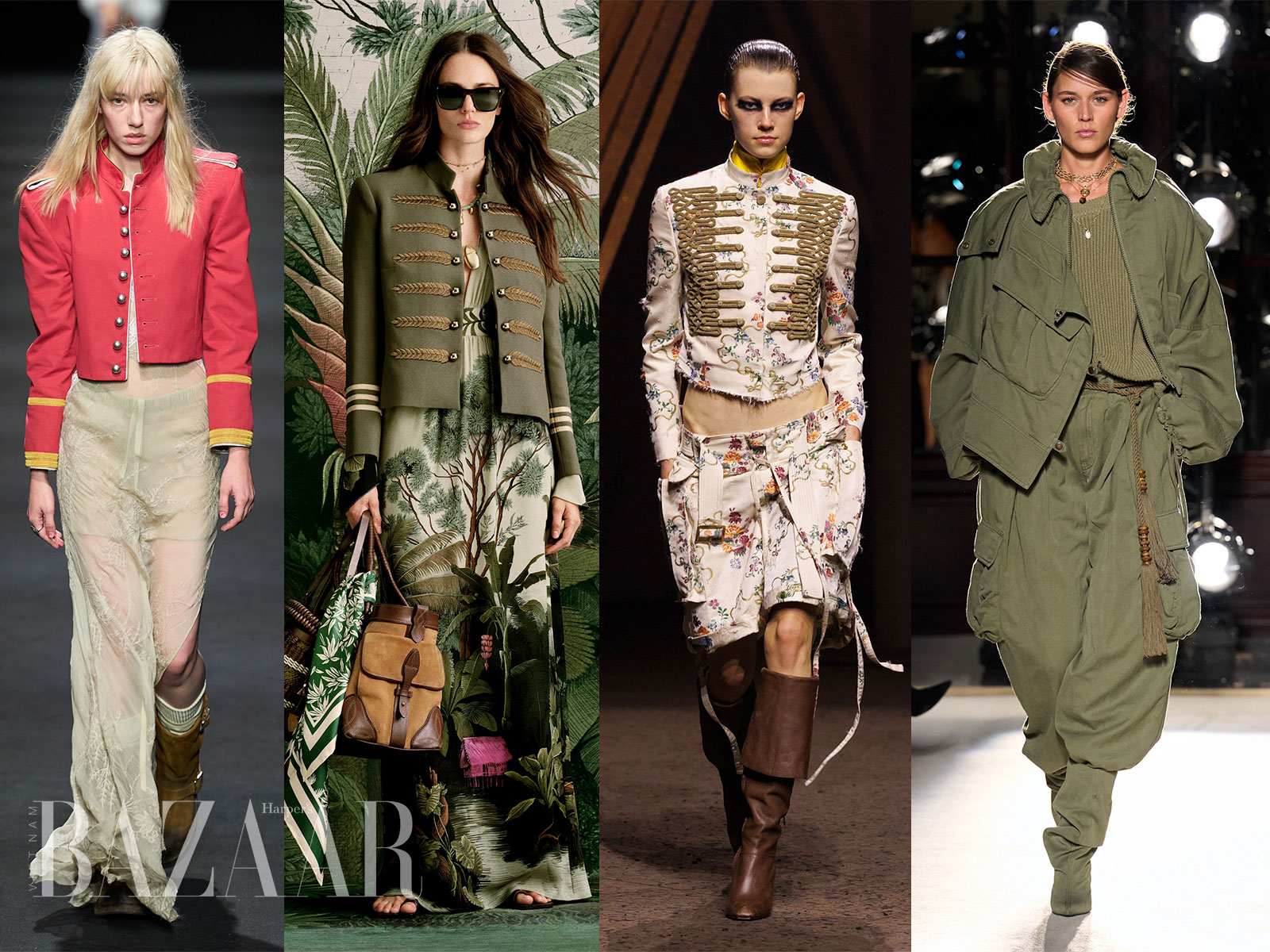 Trang phục lấy cảm hứng từ quân đội trở lại mùa Xuân Hè 2026 chủ yếu qua hai hình thức: Áo khoác quân đội và bảng màu lính. Dior đặc biệt lăng xê trào lưu này với những chiếc mũ ba múi tri ân Napoleon Bonaparte, còn ở các sàn diễn khác, áo khoác mang tinh thần military xuất hiện nhan nhản. Còn trong trường hợp bạn không muốn mặc trang phục mang hình ảnh quân đội quá rõ nét, bảng màu camo với xanh rêu, xanh lính, vàng nghệ và nâu đất là lựa chọn thay thế phù hợp.