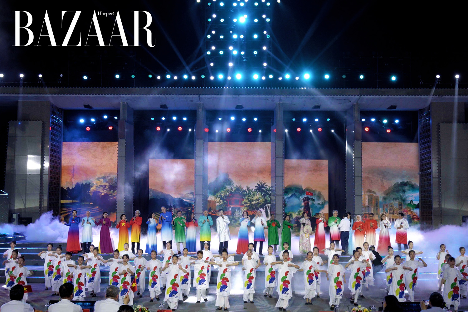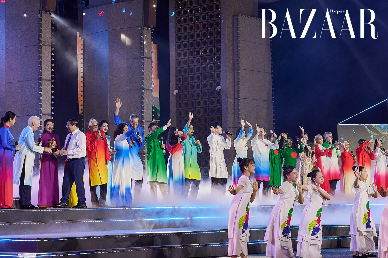 21 Đại sứ, phu nhân các nước mặc áo dài cùng ca sĩ Phạm Anh Duy và Suboi trên sân khấu Vang mãi khúc khải hoàn