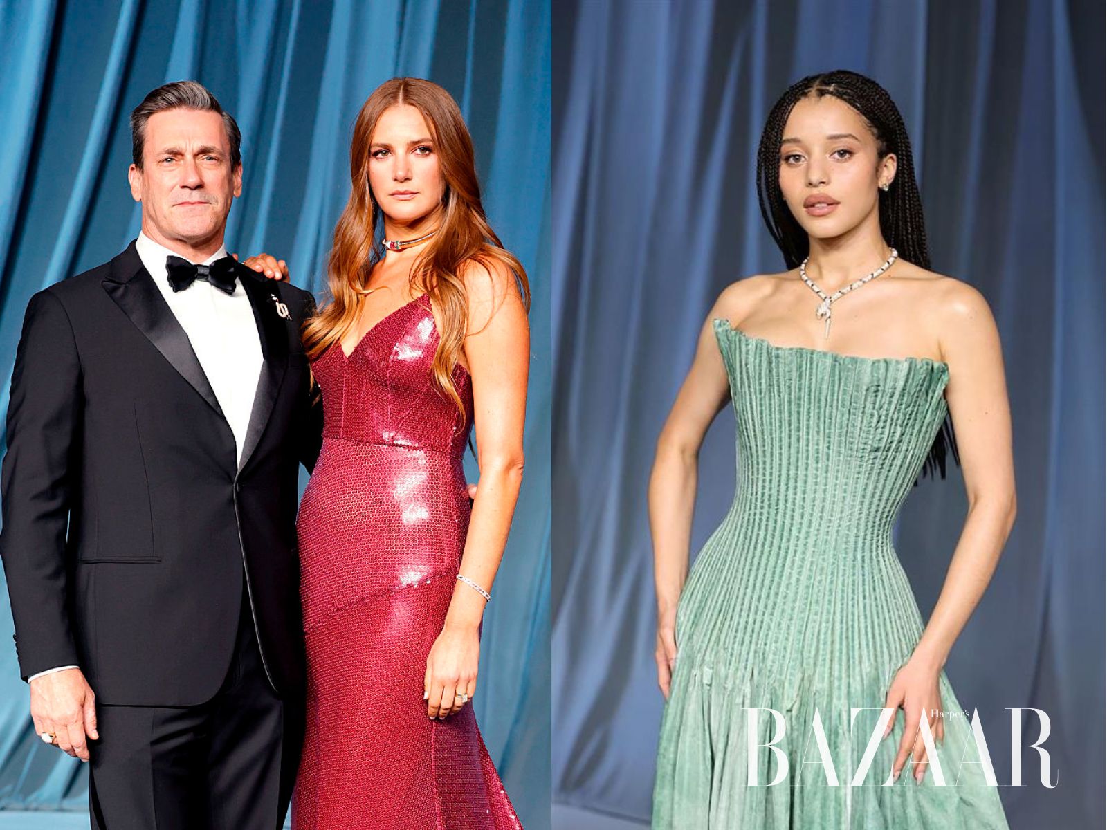 Cả Chase Infiniti và cặp đôi Jon Hamm và Anna Osceola đều lựa chọn trang sức BVLGARI để hoàn thiện trang phục dự thảm đỏ Academy Museum Gala 2025. Ảnh: Getty Images