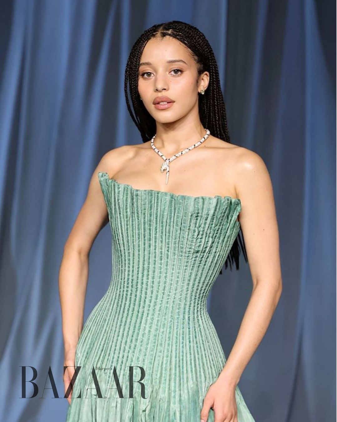Nữ diễn viên Chase Infiniti là gương mặt trẻ đang được chú ý tại Hollywood. Xuất hiện tại Academy Museum Gala 2025, cô chọn chiếc đầm corset màu xanh bạc hà mềm mại cùng bộ trang sức High Jewelry Serpenti của BVLGARI tôn lên đường nét thanh thoát nơi cổ và vai trần.