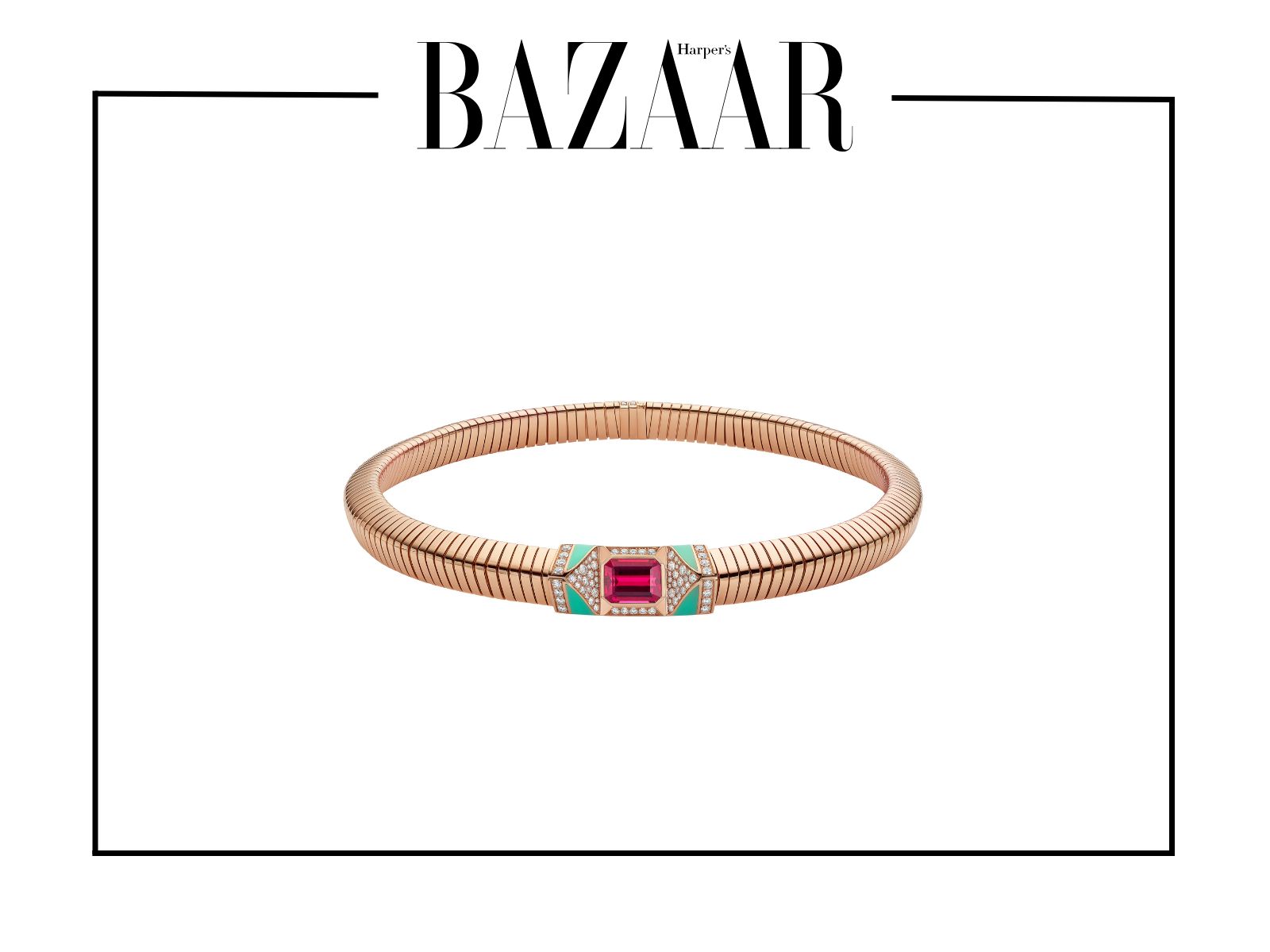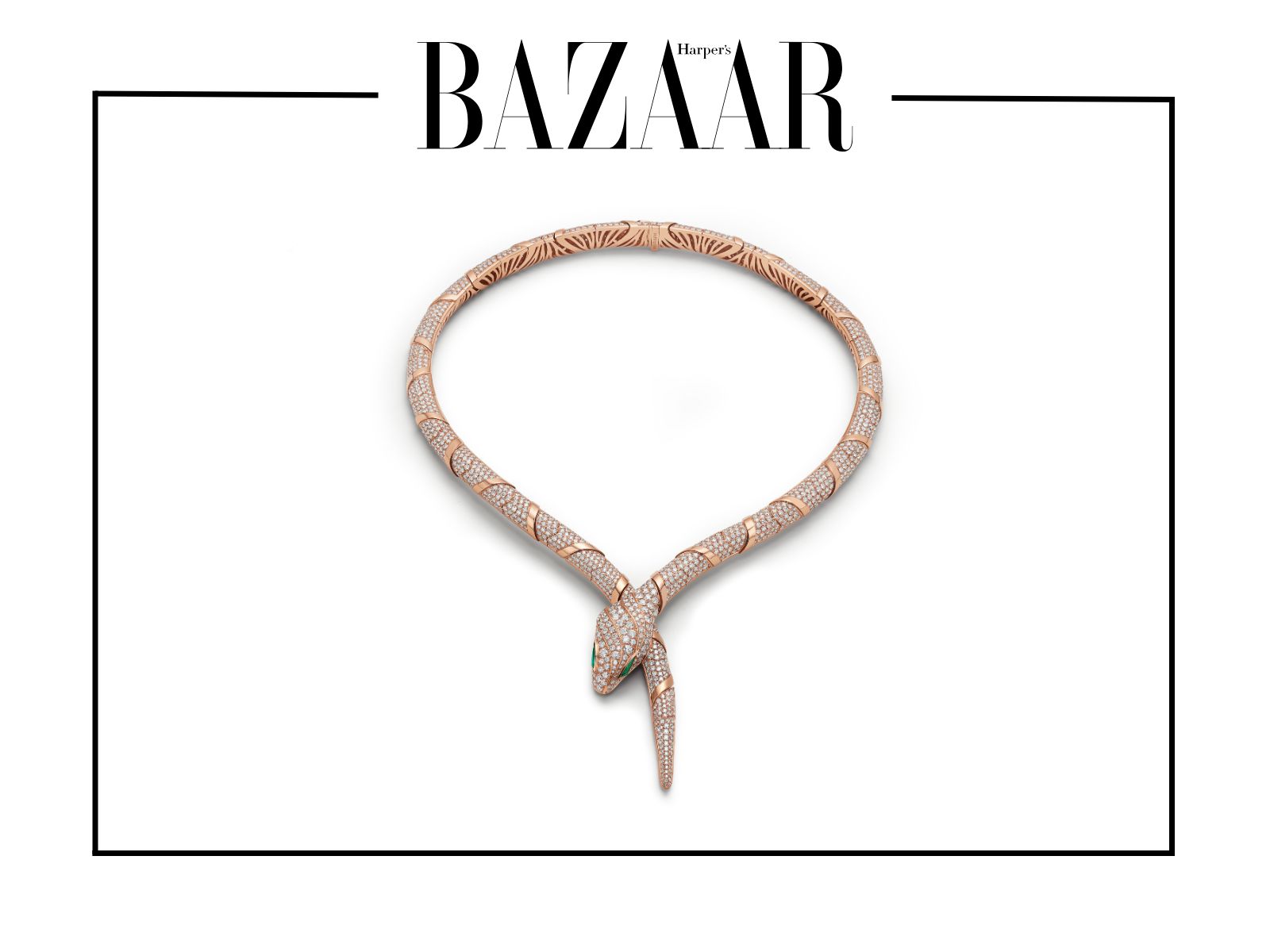 Vòng cổ Serpenti bằng vàng hồng được đính hai viên ngọc lục bảo buff top cut cùng vô số kim cương pavé. Chiếc vòng cổ này thể hiện kỹ nghệ chế tác bậc thầy của thương hiệu kim hoàn Ý. Sự lựa chọn này mang lại hiệu ứng ánh sáng tinh tế nhưng vẫn giữ nguyên nét quyền lực biểu tượng của thương hiệu.