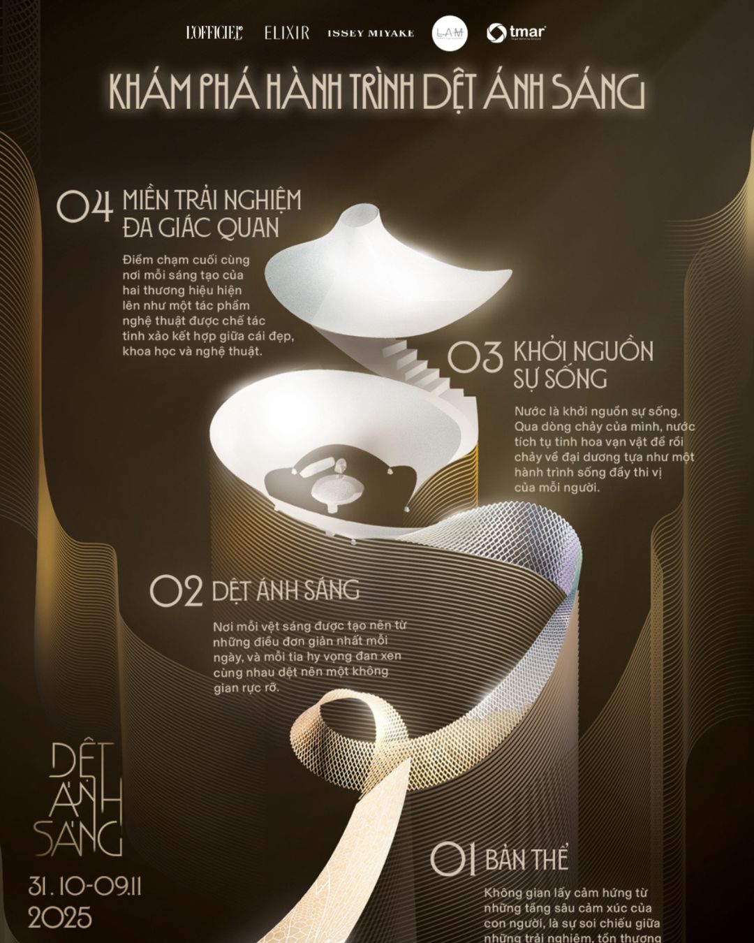Triển lãm Dệt Ánh Sáng không tuân theo logic tuyến tính của câu chuyện thương hiệu, mà đi theo nhịp điệu chậm rãi, có chủ đích của một hành trình cảm xúc gồm bốn miền: Bản thể – Dệt Ánh sáng – Khởi nguồn vạn vật – Miền trải nghiệm giác quan.