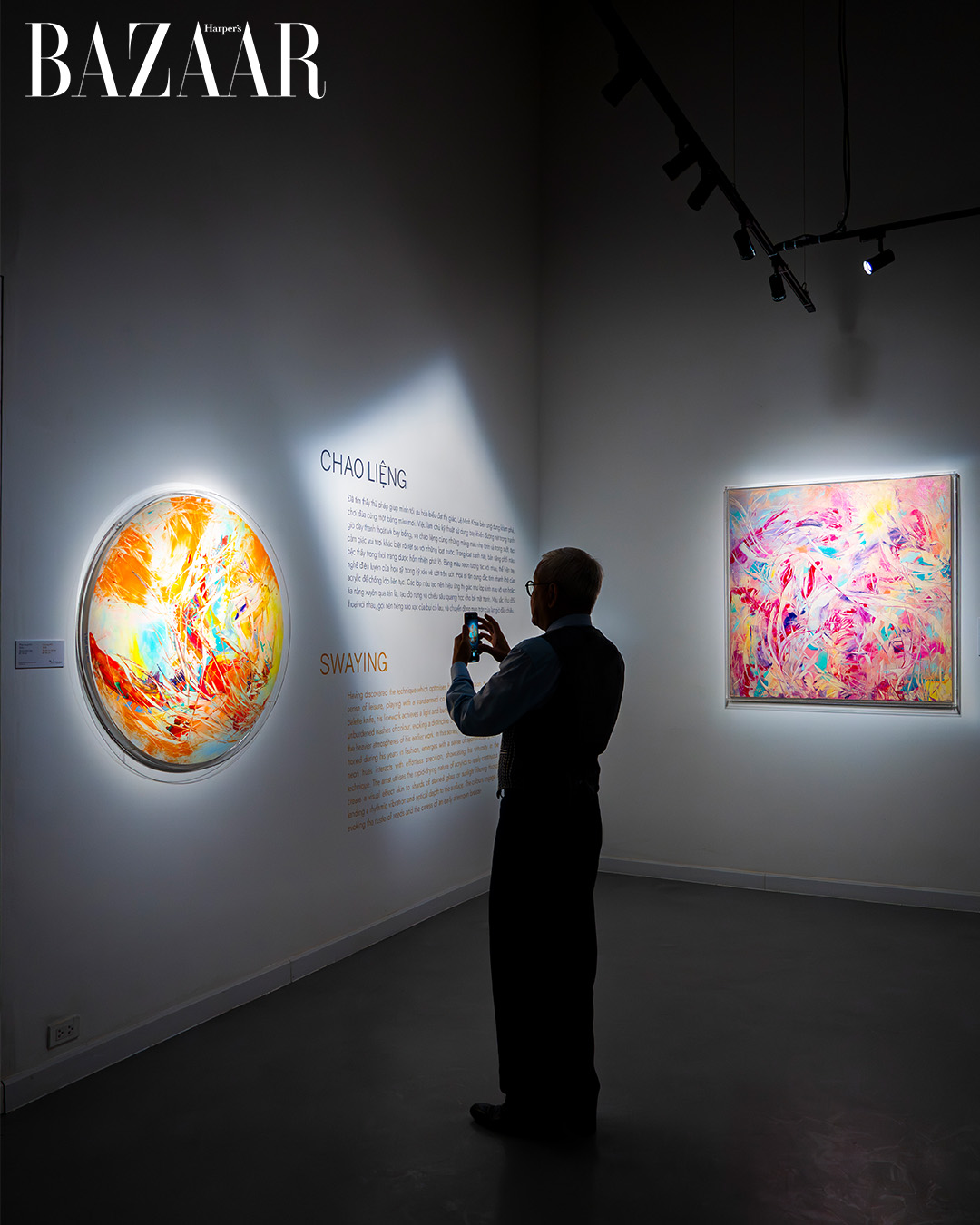 Trong thời trang, anh khám phá màu sắc thông qua chất liệu, cấu trúc và sự chuyển động của vải trên cơ thể. Trong hội họa, những trải nghiệm đó được chuyển hóa thành nét vẽ và lớp màu. Các vệt cọ trong triển lãm Giữa lao xao, thả mình trôi gợi liên tưởng đến sợi chỉ, những mảng màu xếp lớp như nếp gấp vải. Cách phối màu mang tinh thần của việc phối chất liệu trên một bộ trang phục.