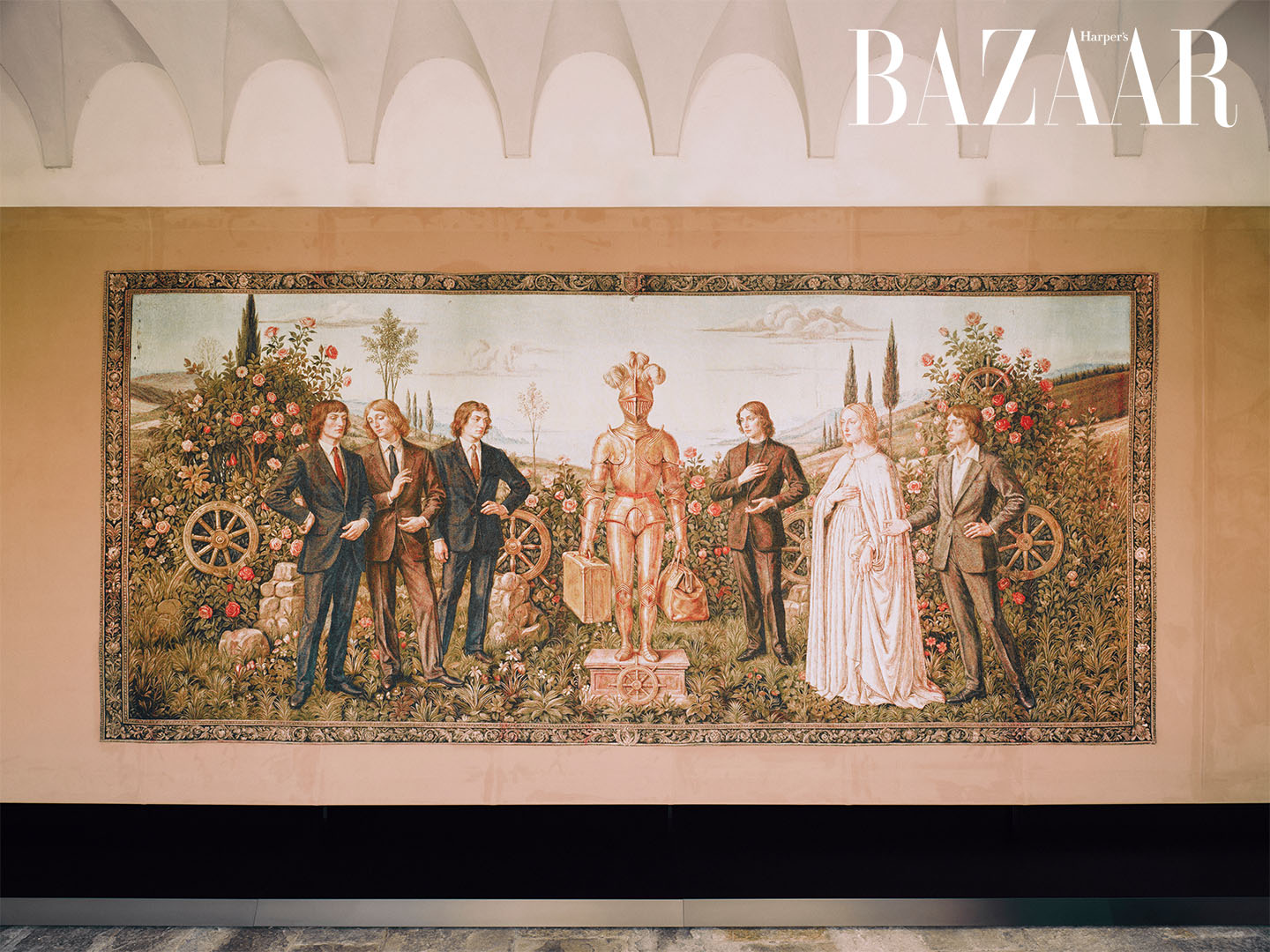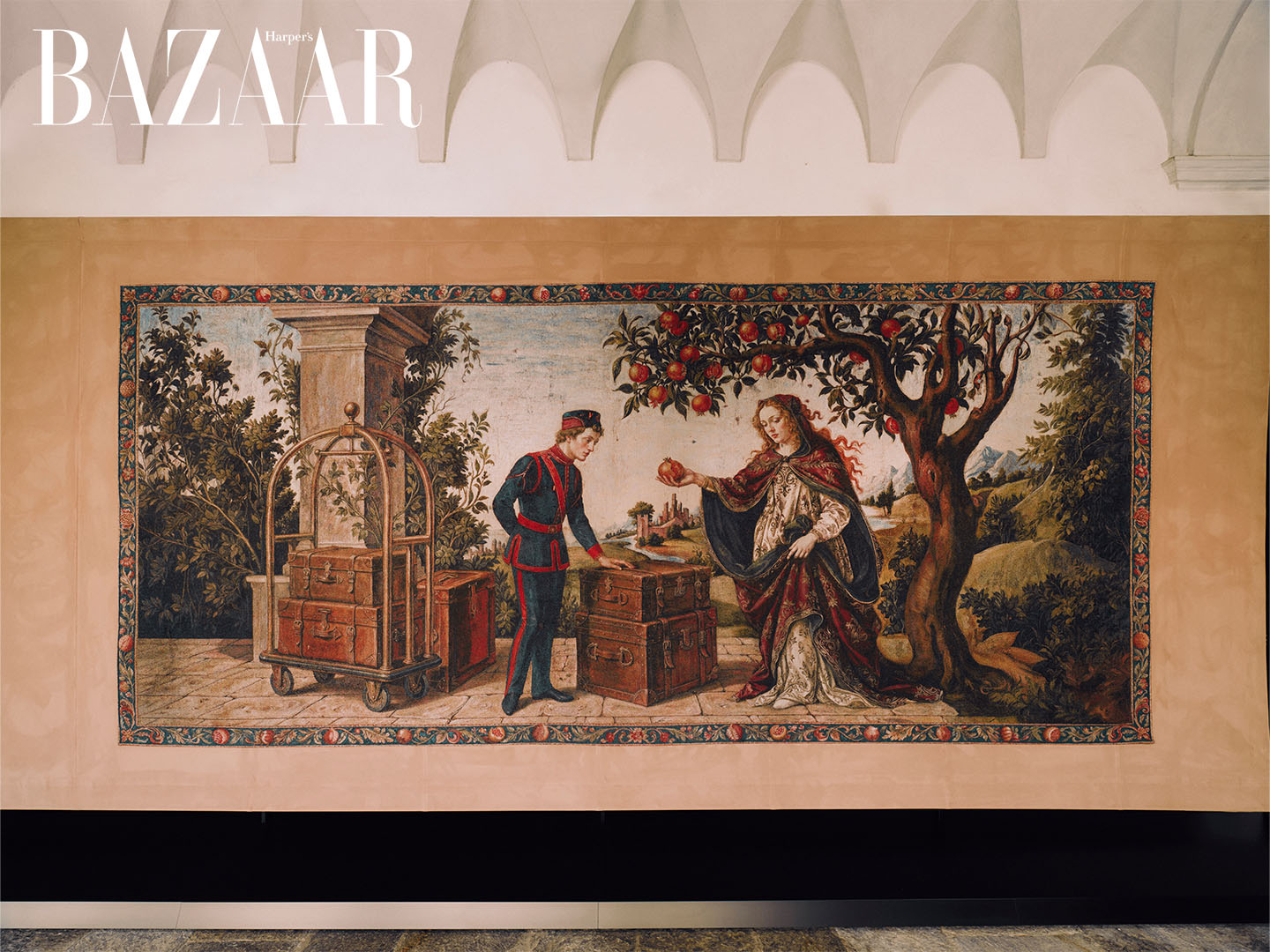 Trung tâm của Gucci Memoria là chuỗi 12 tấm thảm thêu, được xây dựng như một biên niên sử thị giác của nhà mốt. Gắn với truyền thống thủ công lâu đời của Florence, mỗi tác phẩm chuyển hóa một cột mốc quan trọng trong lịch sử Gucci thành một bố cục giàu chi tiết. Khởi đầu từ những năm tháng định hình của Guccio Gucci tại khách sạn The Savoy ở London, chuỗi thảm lần lượt tái hiện quá trình thành lập xưởng thủ công đầu tiên tại Florence, sự định hình ngôn ngữ thị giác, cho đến khi thương hiệu vươn mình thành biểu tượng xa xỉ toàn cầu.