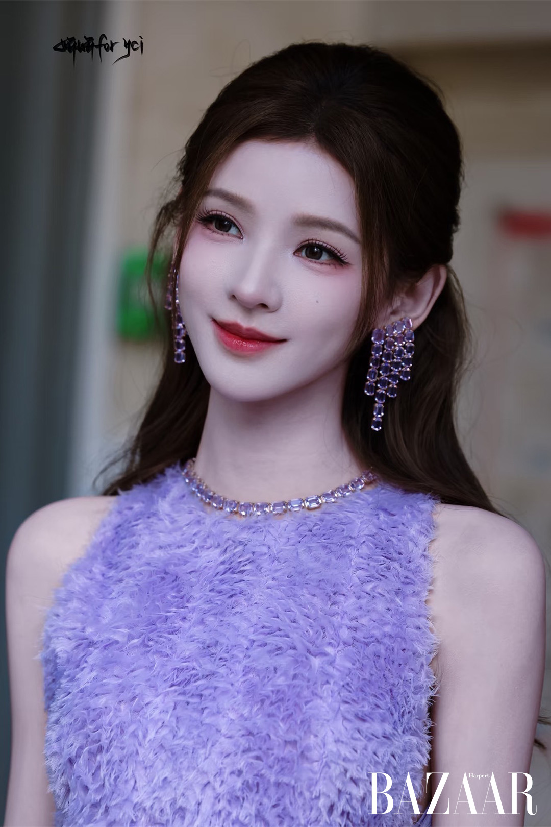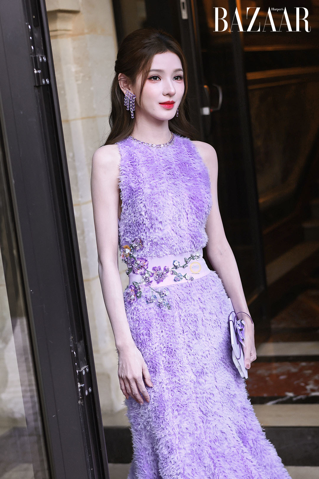 Tạo sự cộng hưởng cùng chiếc đầm, Trương Dư Hi lựa chọn bộ trang sức pha lê cũng ánh tím. Mái tóc xoăn sóng nhẹ, rẽ ngôi giữa tự nhiên, cùng lớp trang điểm trong veo với đôi môi hồng phớt, tất cả góp phần khắc họa vẻ đẹp thanh lịch, tiểu thư với khí chất kiêu sa.