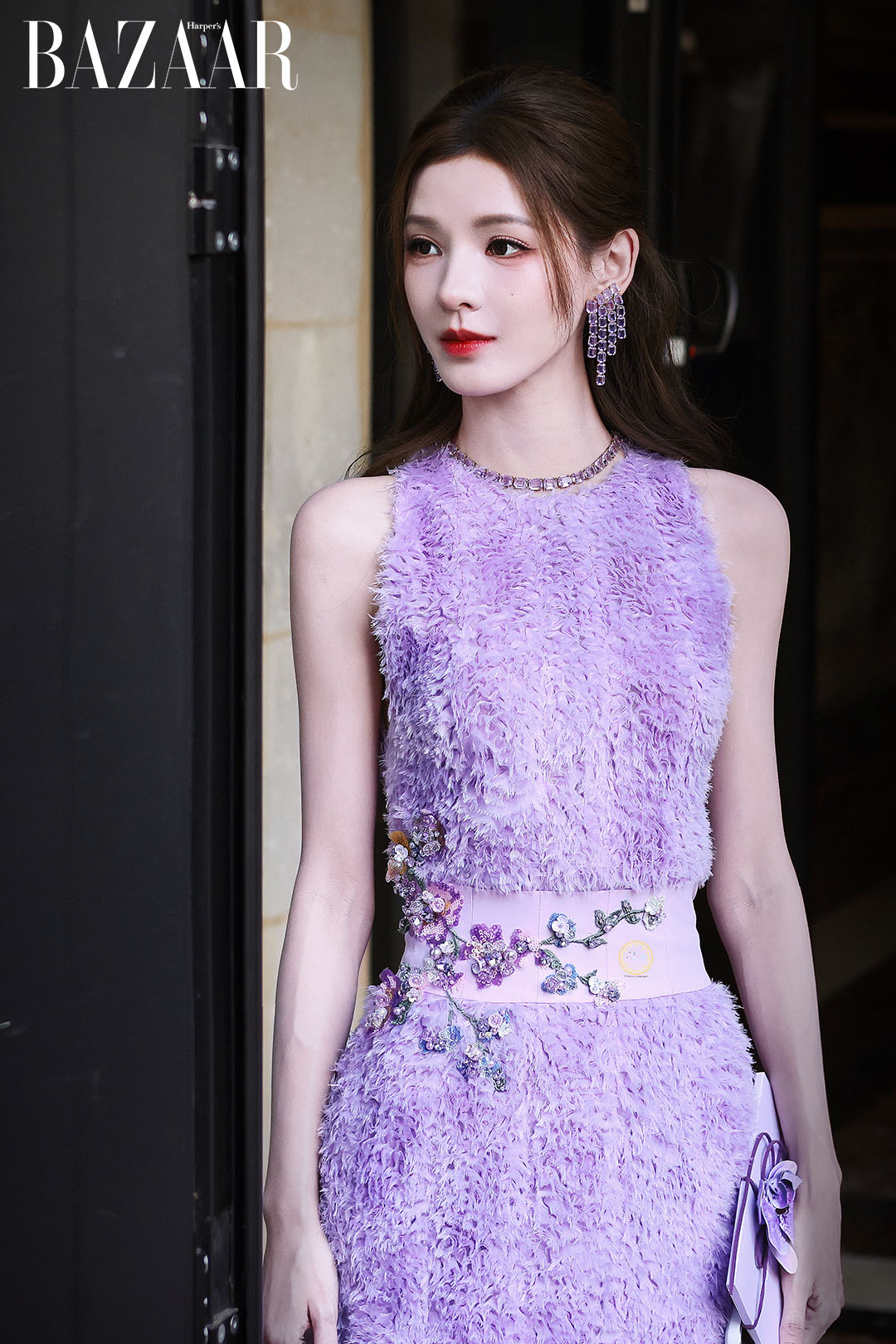 Trương Dư Hi hạ cánh tuần thời trang Paris Xuân Hè 2026 bằng chiếc đầm lông vũ tím ngắt từ nhà mốt LA KORADIOR
