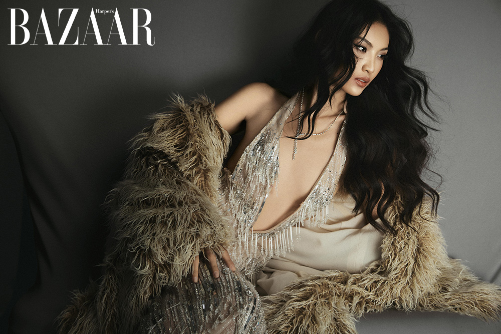 Trong thiết kế đầm dạ hội đính đá kết hợp áo choàng lông, người mẫu Tú Anh thể hiện trọn vẹn thần thái của một hình mẫu high fashion đích thực. Phom dáng ôm sát và cổ khoét sâu làm nổi bật đường vai thanh mảnh và phần cổ đầy kiêu hãnh của Quán quân The Face Vietnam 2023. Những khoảng cut-out có chủ đích trở nên mềm mại và giàu nhịp điệu hơn nhờ khả năng kiểm soát hình thể và ánh nhìn điềm tĩnh, sắc lạnh của Tú Anh, tạo nên sự gợi cảm vừa đủ, không phô trương.