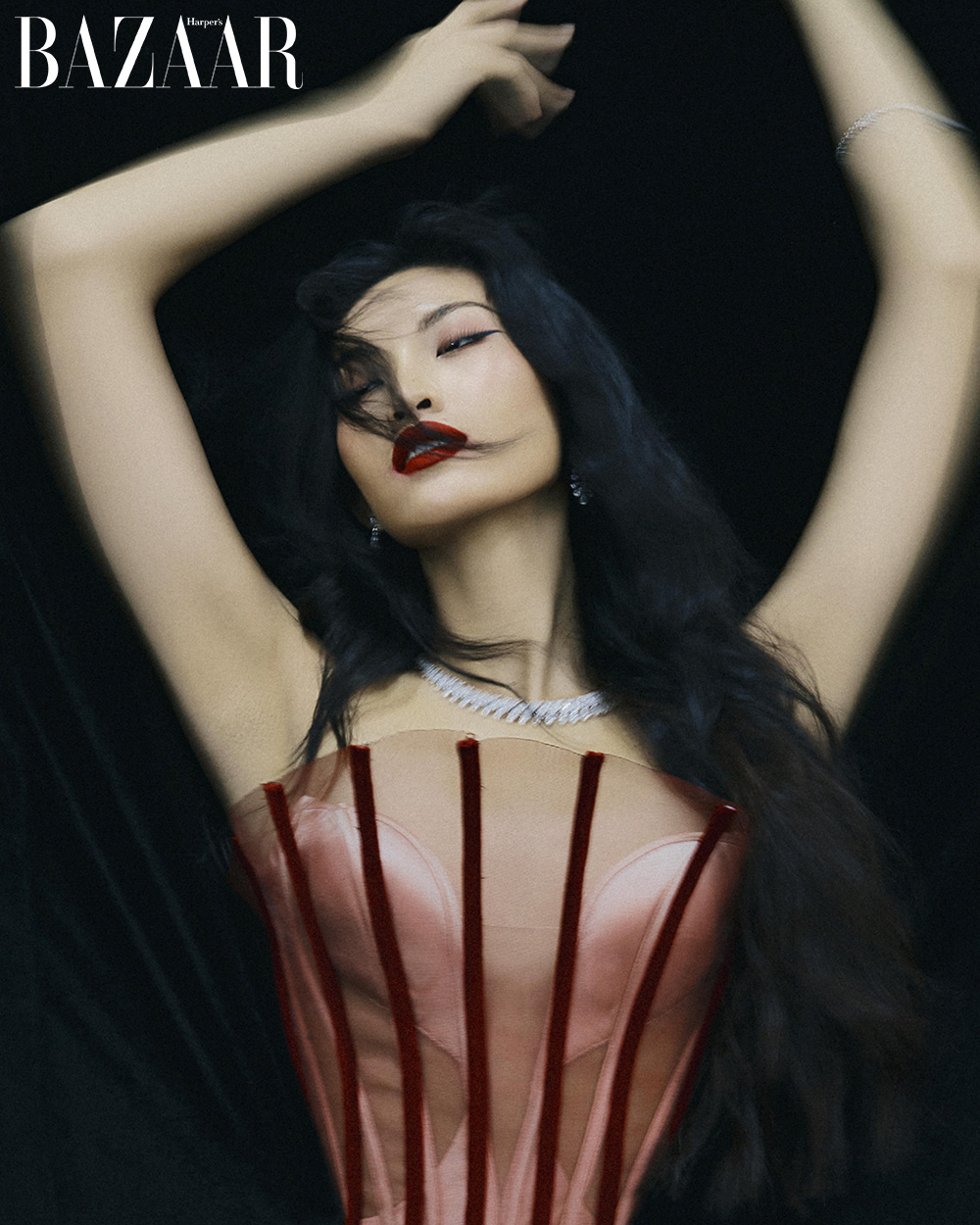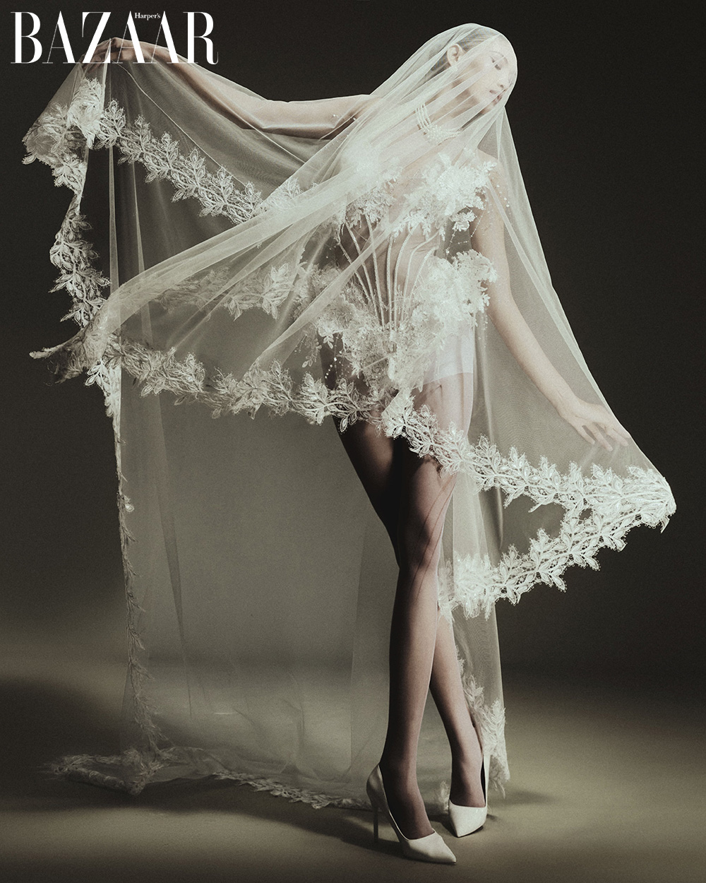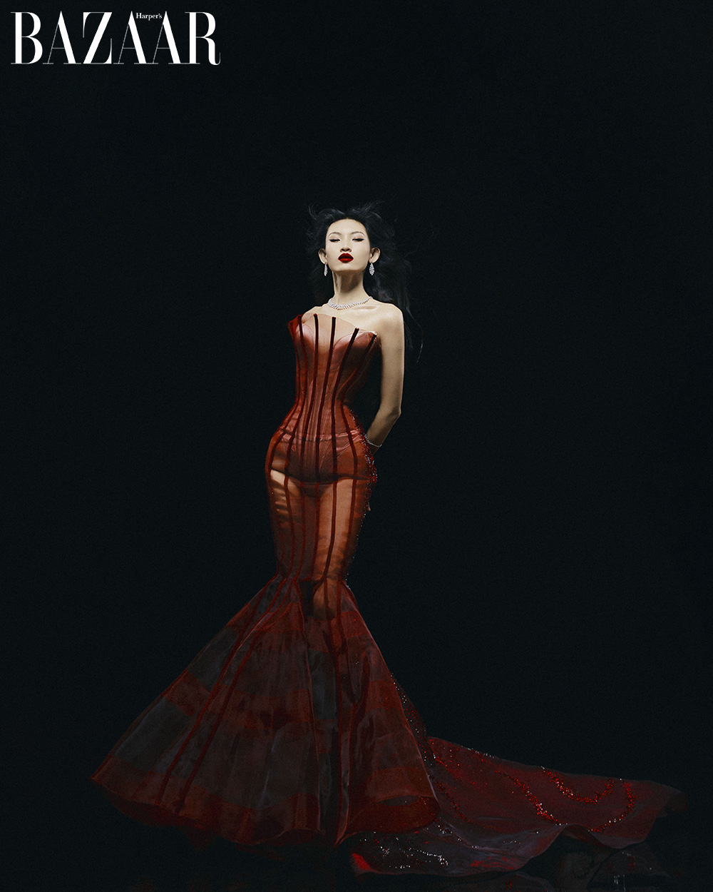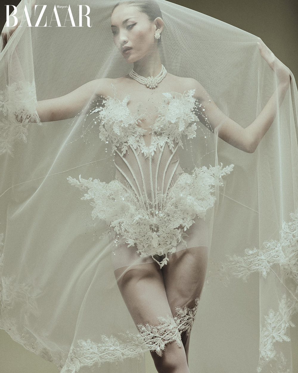 Trong thiết kế này, Tú Anh thể hiện vẻ đẹp mang tính couture rõ nét, nơi hình thể và cảm xúc được kiểm soát ở mức độ tinh tế. Form corset lưới xuyên thấu ôm trọn cơ thể được cô diễn giải bằng thần thái điềm tĩnh và sự tiết chế chuẩn mực, giúp cấu trúc dựng form hiện lên sắc nét nhưng không nặng nề.