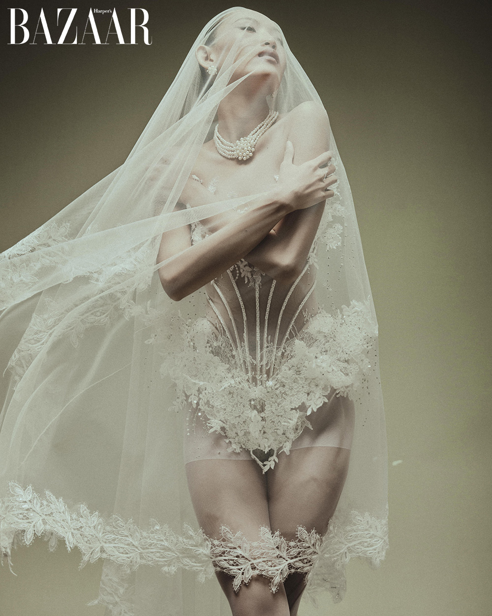 Trong thiết kế này, Tú Anh thể hiện vẻ đẹp mang tính couture rõ nét, nơi hình thể và cảm xúc được kiểm soát ở mức độ tinh tế. Form corset lưới xuyên thấu ôm trọn cơ thể được cô diễn giải bằng thần thái điềm tĩnh và sự tiết chế chuẩn mực, giúp cấu trúc dựng form hiện lên sắc nét nhưng không nặng nề.