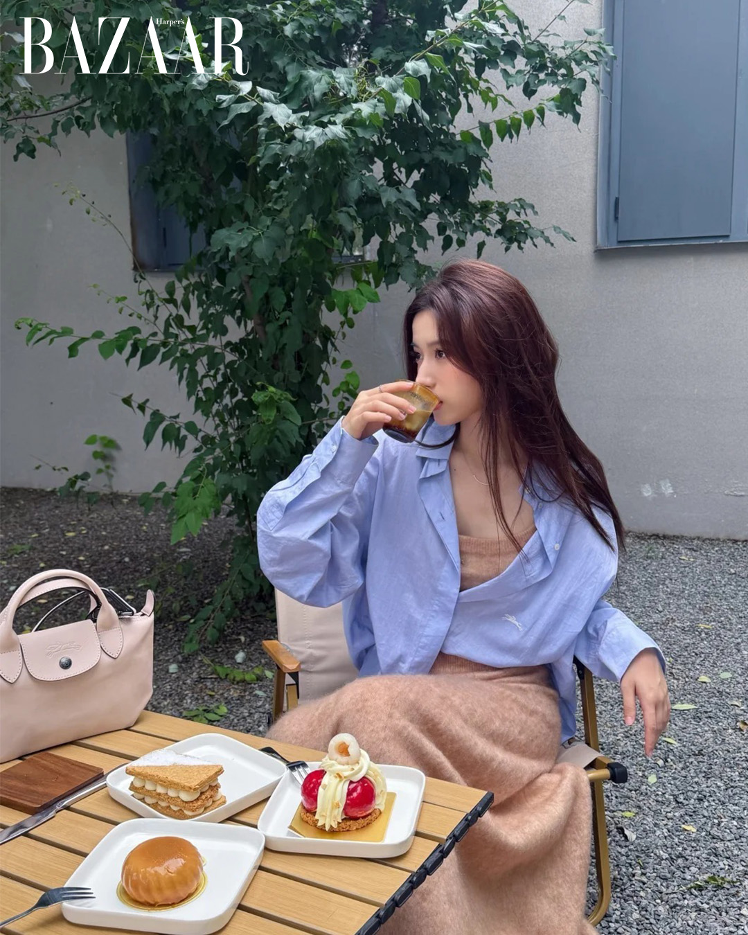 Trong lần xuất hiện tại sân bay, nữ diễn viên chọn cho mình một bản phối mang bảng màu Maillard, nơi những gam nâu ấm, camel và mocha hòa quyện như một buổi chiều cuối thu. Chiếc áo len mặc bên trong ton-sur-ton với túi xách Longchamp Le Smart hình dáng tote.