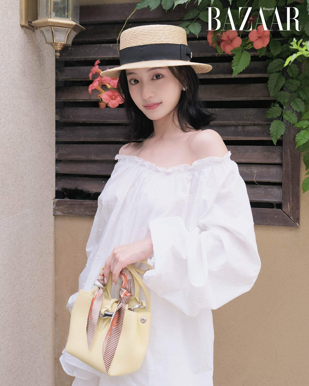 Chiếc túi xách Longchamp Le Roseau sắc vàng non tươi sáng của Hồ Liên Hinh như một lời chào gửi đến những ngày nắng đẹp. Chất da bò vân hạt cao cấp cùng phom túi đứng dáng tạo nên vẻ gọn gàng, trong khi chi tiết khóa tre ánh bạc mang hơi thở Pháp thanh lịch, khiến chiếc túi trở thành điểm nhấn đầy duyên cho tổng thể. Thiết kế linh hoạt với quai xách và dây đeo dài giúp chiếc Le Roseau dễ dàng đồng hành trong mọi khoảnh khắc, từ những buổi dạo biển thong dong đến chiều cafe lười biếng.