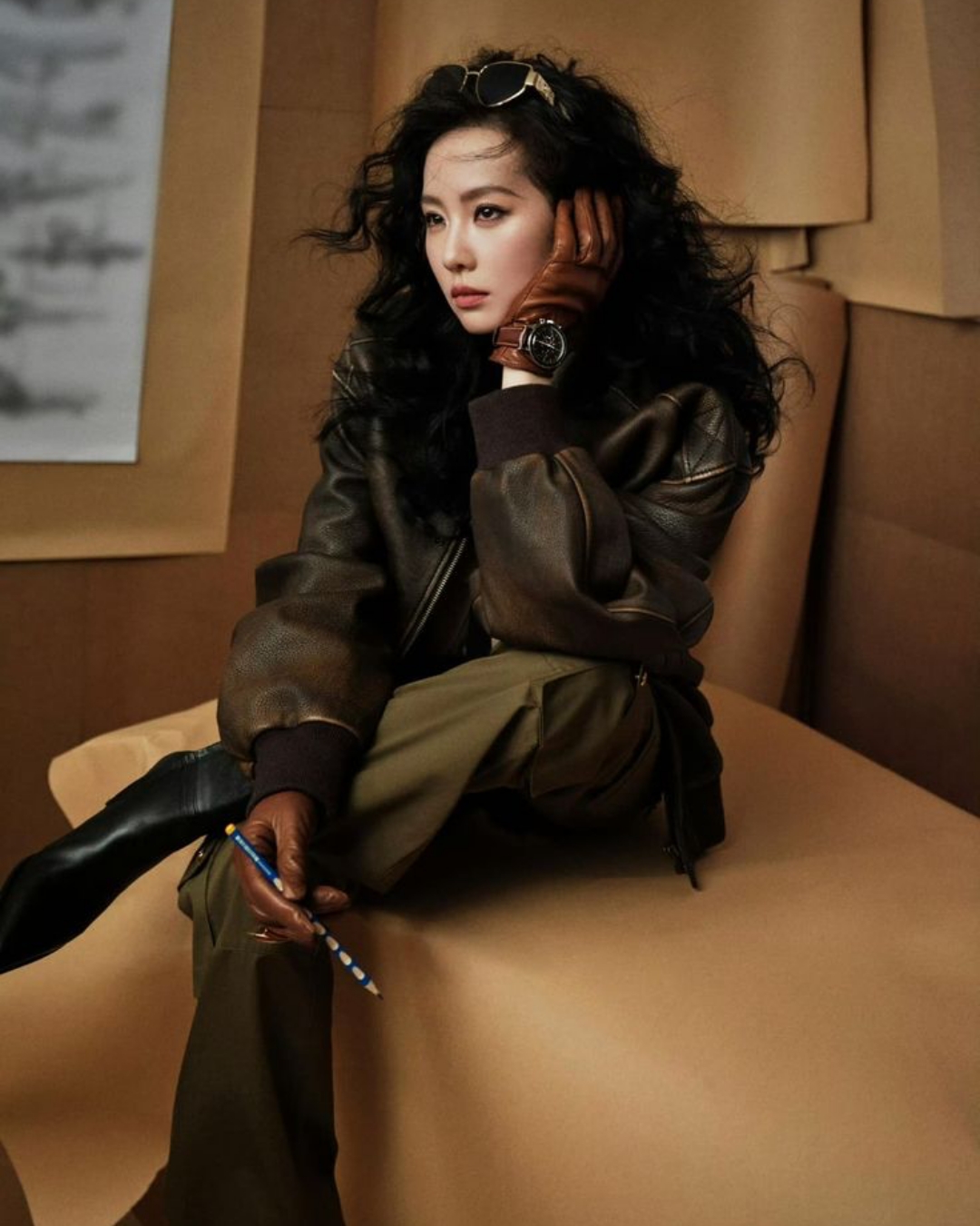 Sức hút của Lưu Thi Thi nằm ở độ tương phản giữa khuôn mặt thanh thoát, làn da sứ mịn màng, cùng kiểu tóc mạnh mẽ và phóng khoáng. Tóc xù mì trở thành điểm phá vỡ khuôn mẫu, làm nổi bật khí chất tự do của người phụ nữ ở ngưỡng 40.