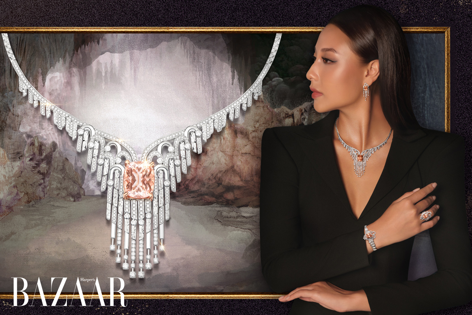 Thiết kế tiếp theo trong hành trình tôn vinh vẻ đẹp phụ nữ của PNJ Masterpiece là Eternal Mystery, bộ trang sức lấy cảm hứng từ vẻ đẹp trầm mặc của động Phong Nha. Thiết kế mô phỏng chuyển động của giọt thạch nhũ theo chiều rơi thẳng, như sự rơi chậm rãi của từng tia đá nhỏ. Ở trung tâm là viên Morganite hồng đào trong suốt, đại diện cho vẻ đẹp nội tâm và sâu sắc của người phụ nữ, nổi bật giữa không gian trầm lặng như một bí mật chỉ người đủ tinh tế mới chạm tới.