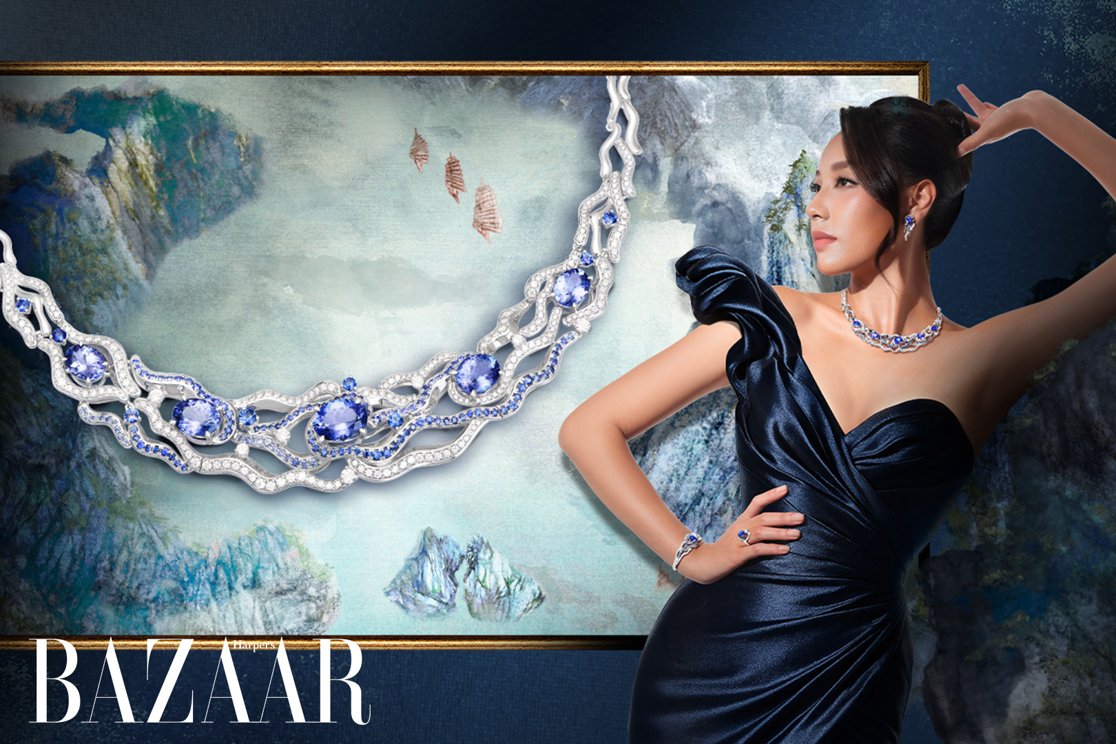 Nếu tuyệt tác Sylvan Glory khơi gợi vẻ đẹp của khu rừng cổ thụ, thì bộ trang sức Curves of Wonder lại tái hiện vẻ đẹp hùng vĩ của Di sản thiên nhiên thế giới Vịnh Hạ Long, nơi sóng nước nhẹ nhàng ôm lấy từng ngọn núi đá vôi. Họa tiết đá Tanzanite và Sapphire được sắp đặt như những vệt sáng phản chiếu trên mặt biển, vừa sâu thẳm vừa lung linh. Các đường cong lượn sóng biểu tượng cho sự chuyển động, tự do và vĩnh cửu. Bộ trang sức Curves of Wonder là biểu tượng cho người phụ nữ mang khí chất cuốn hút, tĩnh mà sâu, mạnh mẽ mà uyển chuyển.