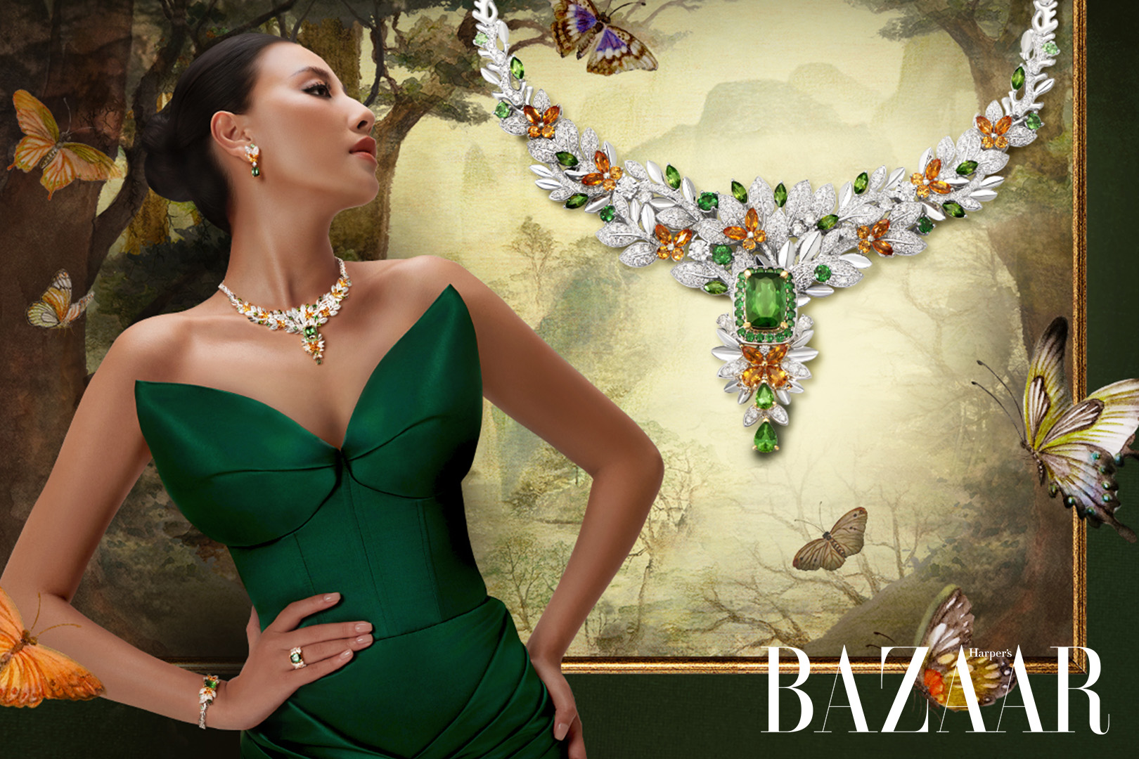 Lấy cảm hứng từ khu rừng nguyên sinh Cúc Phương, nơi thiên nhiên lưu giữ những điều nguyên sơ và sâu lắng nhất, bộ trang sức Sylvan Glory như bản tình ca dành cho thiên nhiên. Sắc xanh của Tourmaline, ánh vàng của Citrine, hòa cùng vẻ lấp lánh của kim cương kể câu chuyện của muôn đàn bướm tung bay, nhuộm màu di sản giữa khu rừng nguyên sinh. Tựa như những người phụ nữ hiện đại kiên cường mà vẫn dịu dàng, sắc sảo nhưng đong đầy yêu thương. Bên cạnh đó, thiết kế hai trong một với mặt dây có thể tháo rời để phối cùng kiểu dây chuyền khác, mang đến sự linh hoạt đầy tinh tế cho phụ nữ hiện đại.