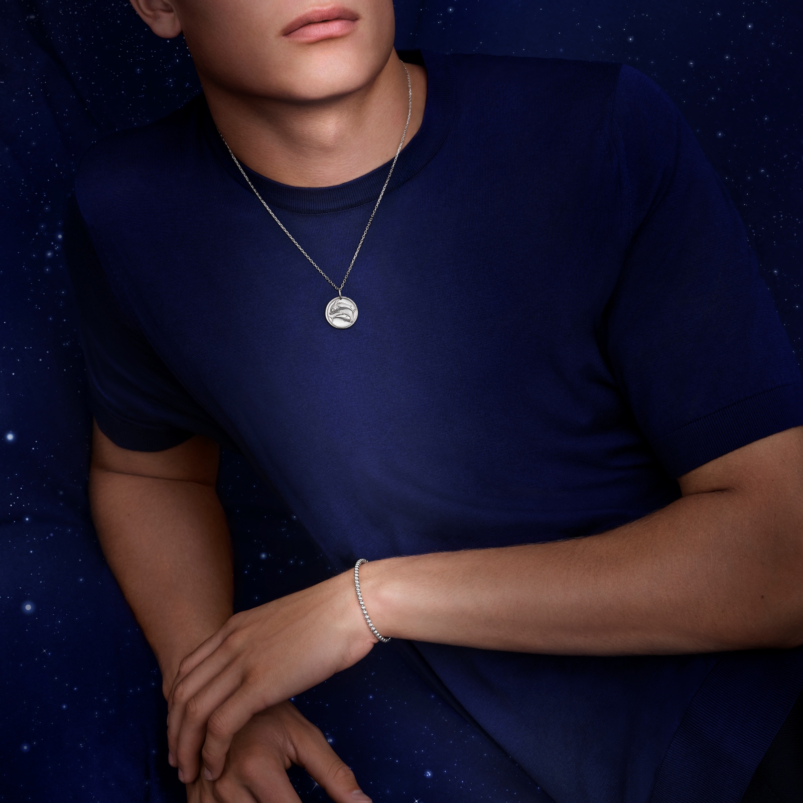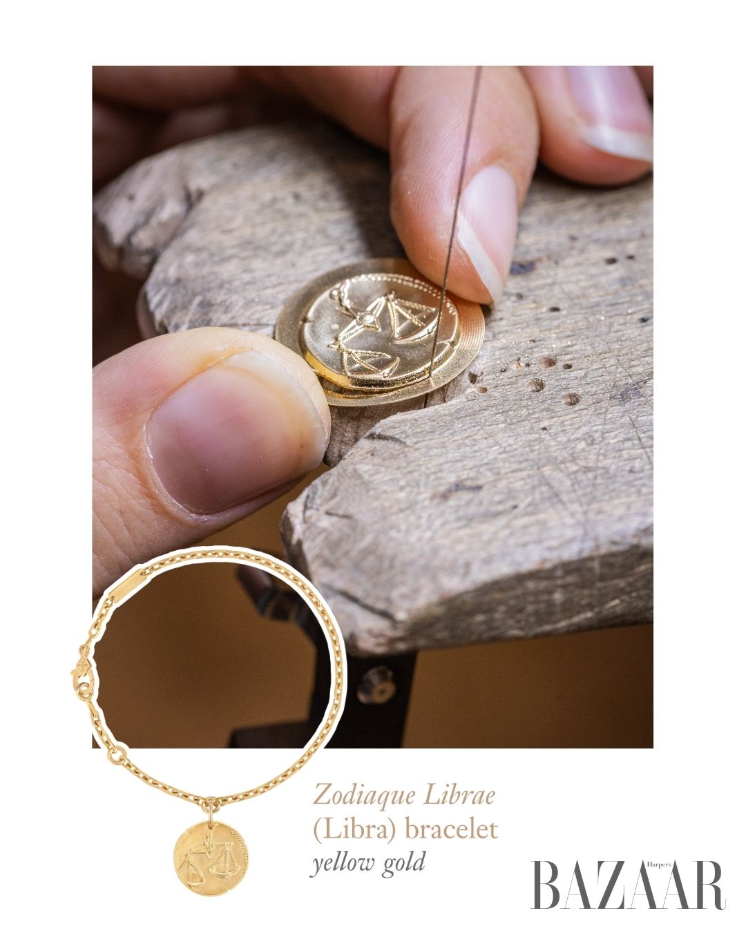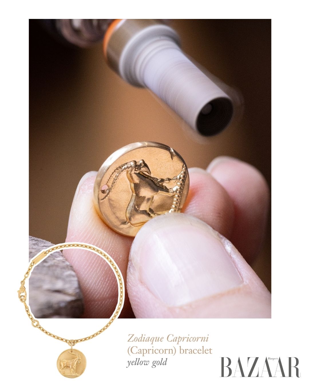 Những huy chương tròn đường kính 16 mm được thu nhỏ vừa vặn cho cổ tay, treo lơ lửng trên dây xích bằng khoen nối, để mỗi chuyển động đều khiến biểu tượng cung hoàng đạo khẽ rung lên như một nhịp thở.