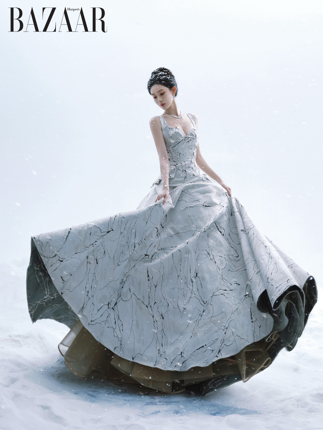 Khí chất cô mang theo là nét đẹp của một nàng thơ mùa đông: lạnh, tĩnh, thanh tao. Ánh mắt khẽ cúi tạo nên vẻ khiêm nhã, dịu dàng mà vẫn phảng phất sự kiêu hãnh.
