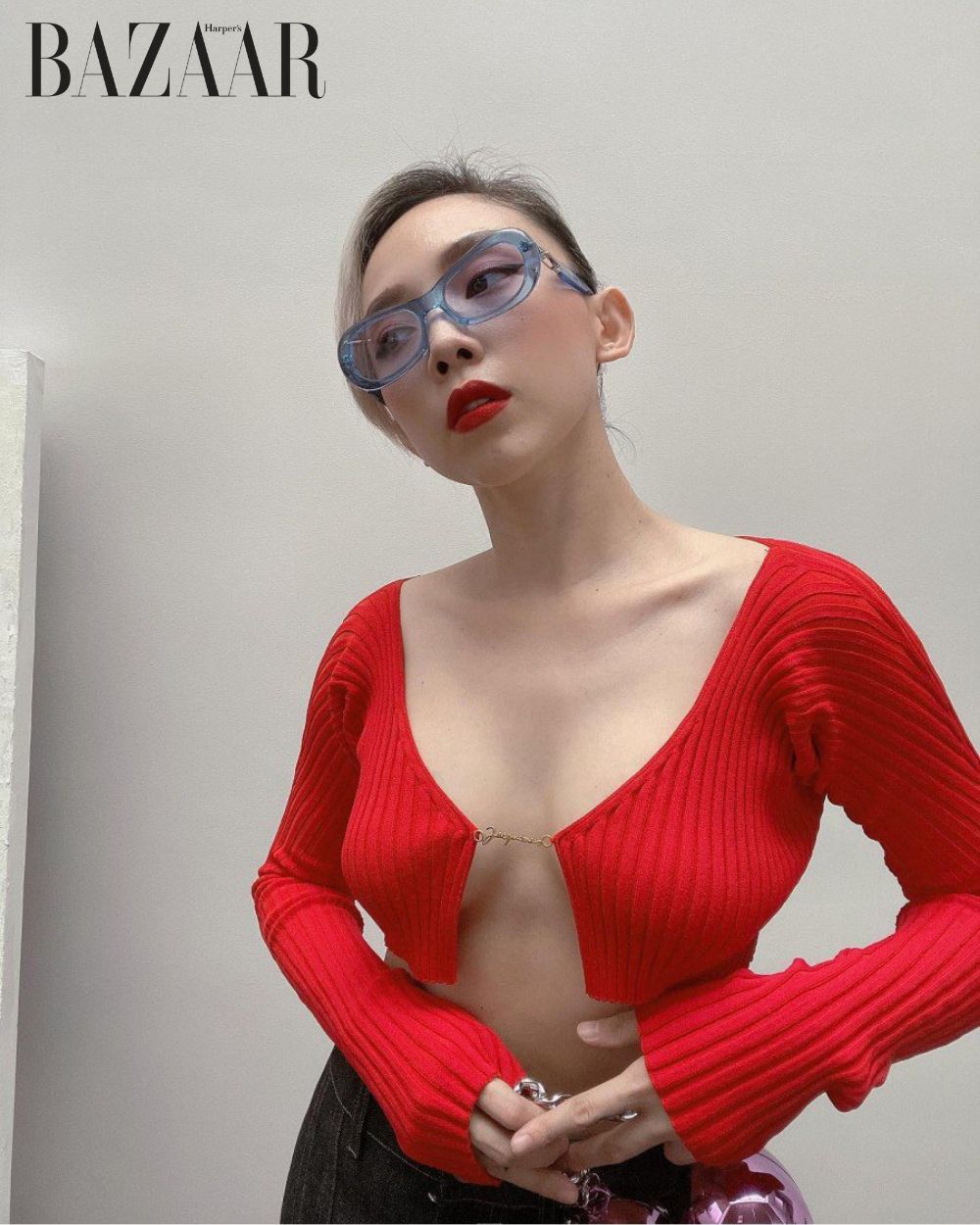 Nếu rất muốn ăn vận thoải mái theo trào lưu no-bra, bạn có thể học hỏi Tóc Tiên. Tại Việt Nam, Tóc Tiên là một trong những ngôi sao rất tích cực tham gia trào lưu không mặc áo ngực. Cô từng gây bão truyền thông khi đăng tải hình ảnh mặc áo len đỏ của Jacquemus mà không có áo ngực đi kèm. Nhìn thì biết là thả rông ngực nhưng Tóc Tiên ý nhị khi dùng miếng dán đầu ngực che chắn.