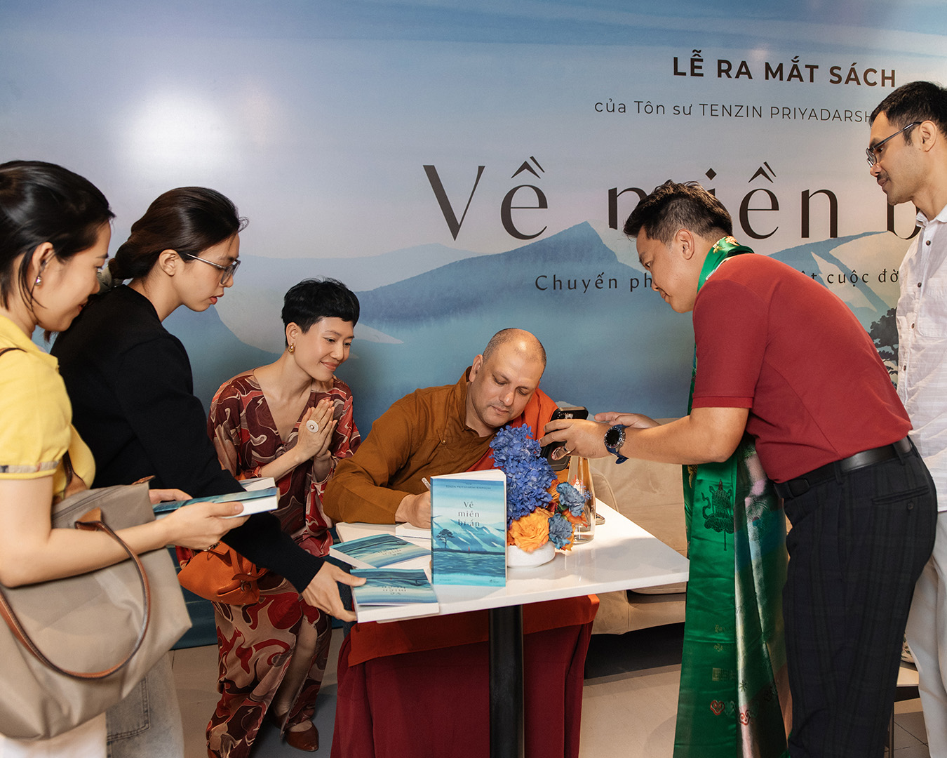 Tôn sư Tenzin Priyadarshi Rinpoche cùng đại diện ban tổ chức, dịch giả cùng các độc giả thân thiết