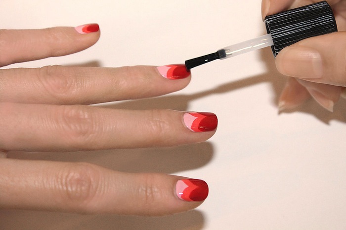 Dùng sơn màu đỏ đậm tạo kiểu tương tự như bước 3. Bắt đầu từ phần giữa một bên móng kéo đường vòng ôm theo lớp màu hồng đậm/cam. Làm tương tự với bên kia sao cho hai đường cong gặp nhau tại trung tâm móng.