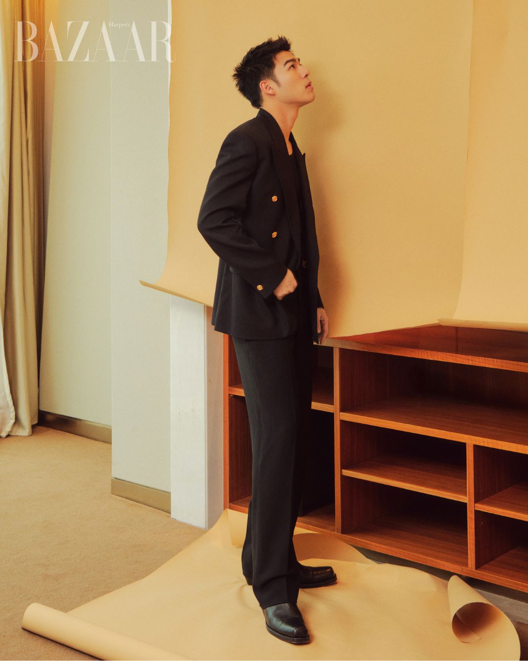 Diễn viên Đài Loan Trần Hạo Sâm nam tính với phục trang từ bộ sưu tập ICONS, áo vest đen, quần âu đen, kết hợp cùng giày bốt da đen từ nhà mốt.