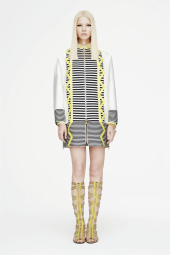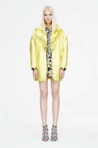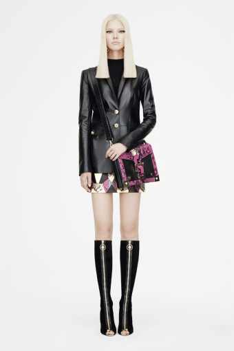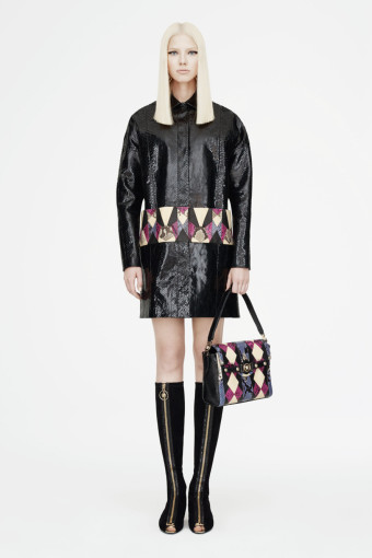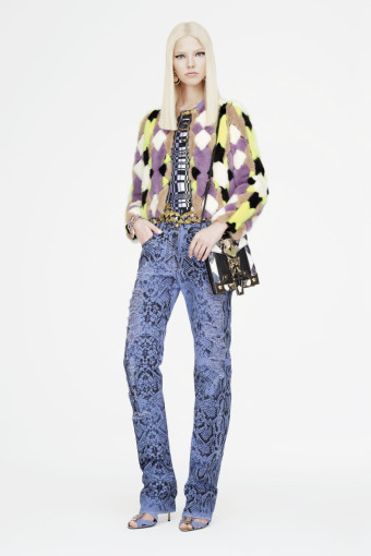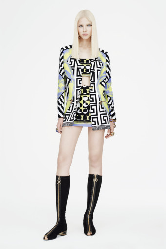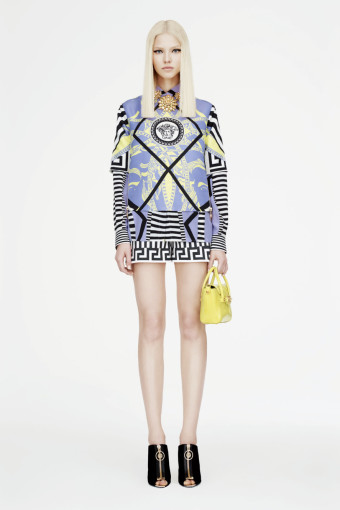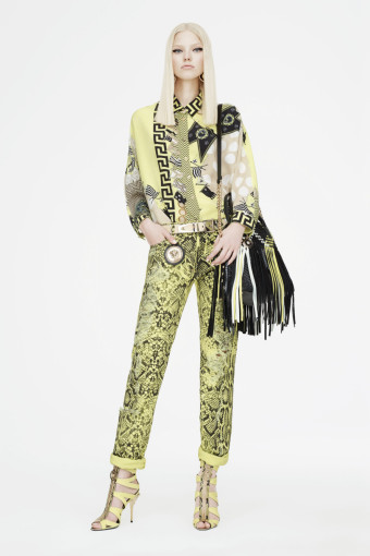 Bộ sưu tập Resort 2015 lần này của Versace lấy cảm hứng từ trang phục thập niên 1960 với những bộ đầm suôn ngắn trên gối cùng nhiều họa hình đa dạng. Nhà thiết kế Donatella Versace đã thêm vào đó những họa tiết đặc trưng mà người anh Gianni Versace đã khởi xướng. Đó là biểu tượng nữ thần đầu rắn Medusa trên logo Versace và các hoa văn Hy Lạp cổ khác. Trong khi đó, họa tiết chấm bi và hình ảnh các lá cờ xen lẫn vào nhau cũng tạo nên những hình in đặc sắc. Ngoài ra, quần mang họa tiết da trăn hay váy ngắn motif hình học nhiều màu sắc cũng góp thêm sự phong phú cho bộ sưu tập.