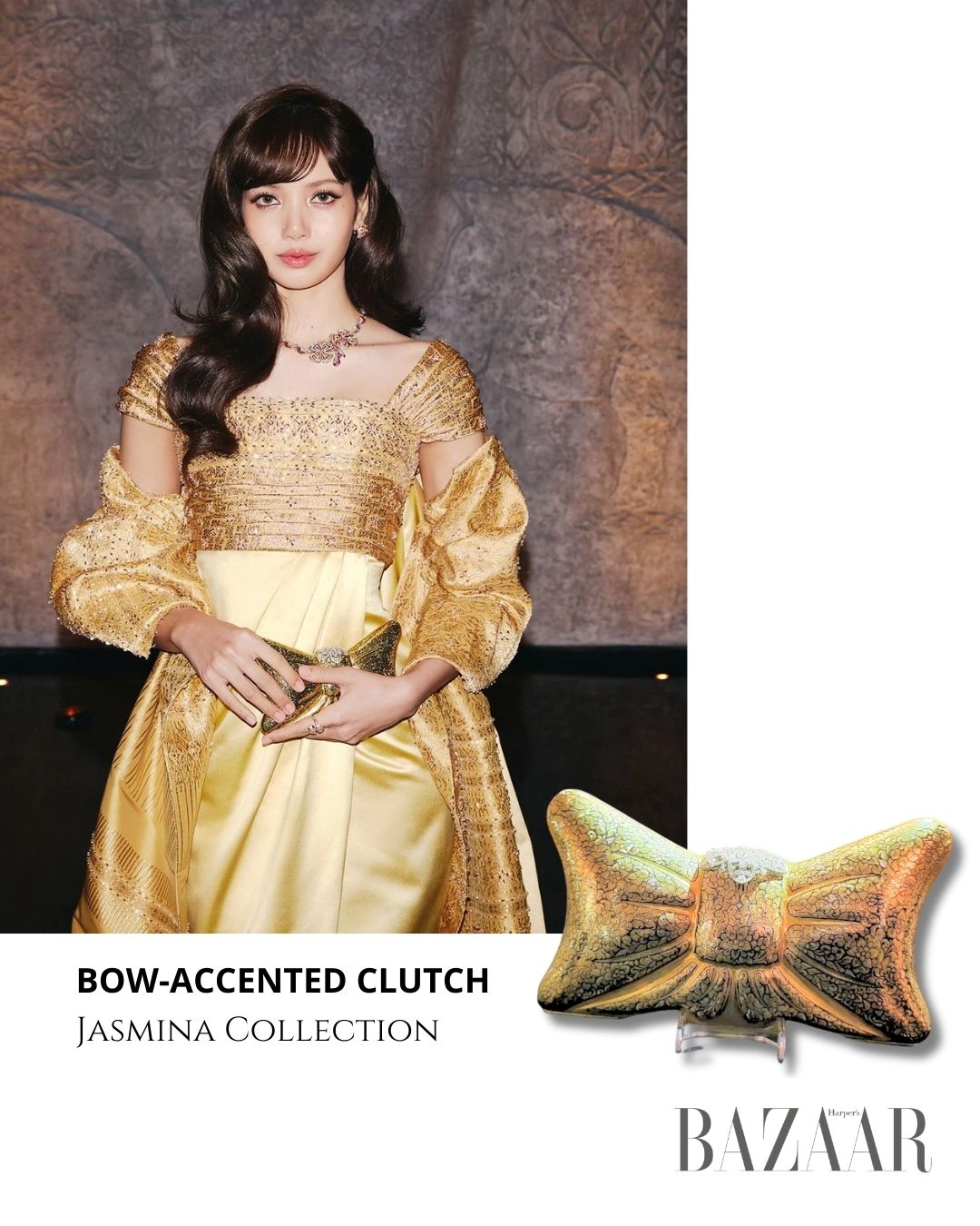 Trang phục được hoàn thiện bằng trang sức BVLGARI và clutch nơ từ thương hiệu Thái Jasmina. Cách phối phụ kiện cho thấy định hướng rõ ràng: giữ cân bằng giữa xa xỉ quốc tế và sự hiện diện của thời trang nội địa.