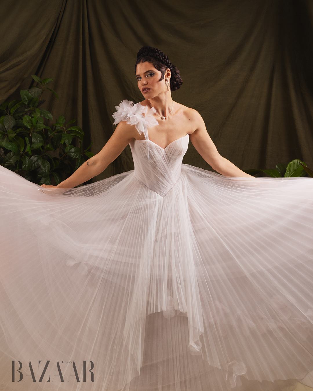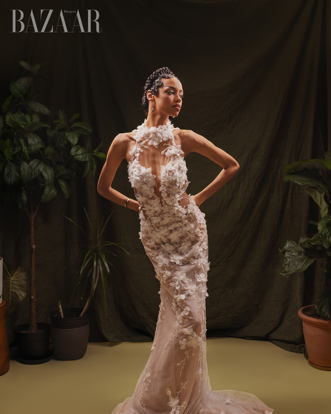 Daisy Oh. Đầm hoa: Julie Vino (Nicole Bridal). Trang sức: Eileen Papas.